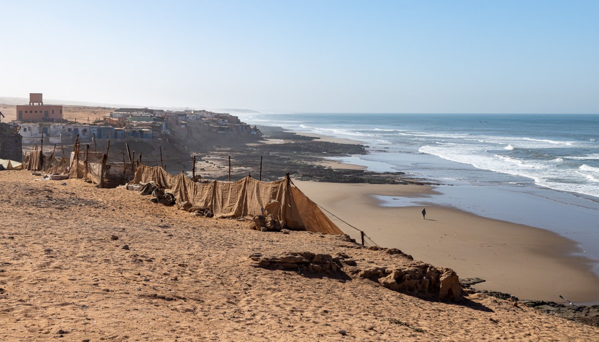 Après un mois passé dans le Haut Atlas, nous apprécions de changer de cadre pour un horizon plus rectiligne avec une exploration de la côte avec ça et là des sortes de villages de maison faites de bric et de broc de Marocains adeptes de la pêche mais peut-être aussi de quelques familles pauvres.