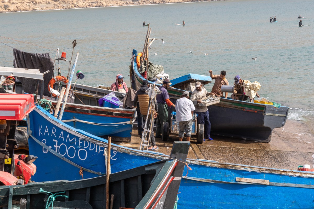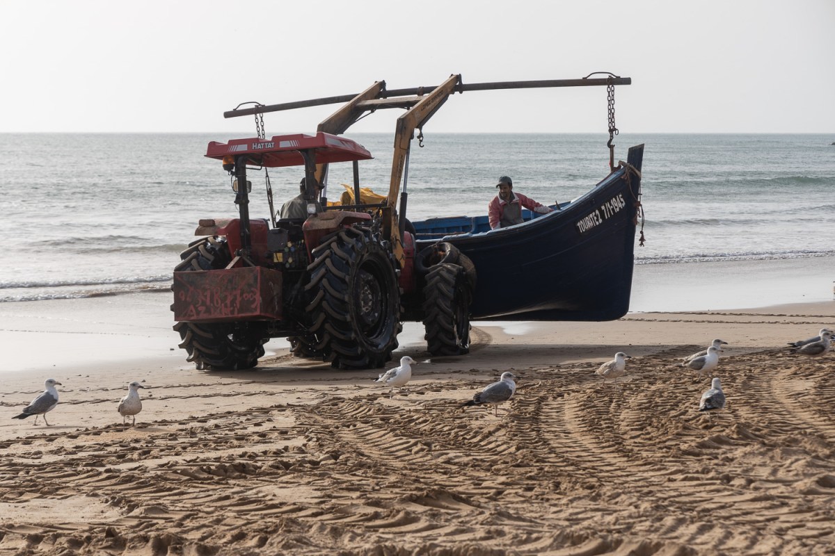 Première étape à Imsouane. Un port en pleine activité ! Les barques vont et viennent, tirées ou poussées par un tracteur. La criée est bondée, les caisses de poissons fraîchement débarquées passent des bascules aux coffres des voitures. Les restaurants de poissons grillés font le plein, nous trouvons une table avec vue sur les vagues.