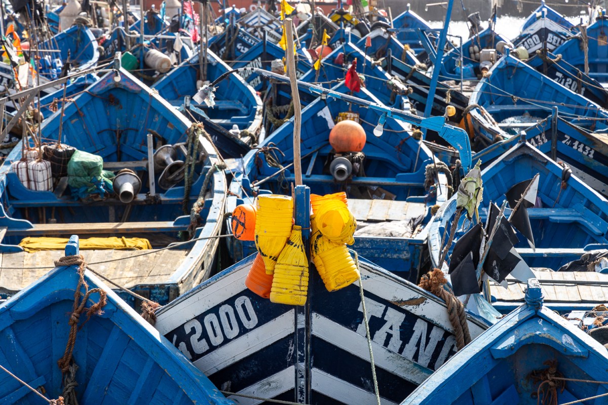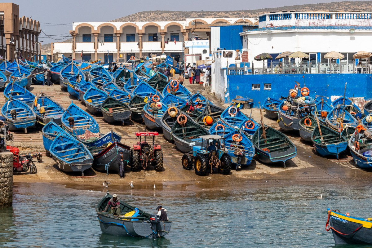 Essarouira. LA ville Marocaine bien connue, avec son port très actif. La vente de poissons se fait directement au débarquement, les barques à flot côtoient la flotte des chalutiers. L’architecture de la ville reflète la richesse passée, les encadrements des portes en pierres sculptées en sont les témoins.