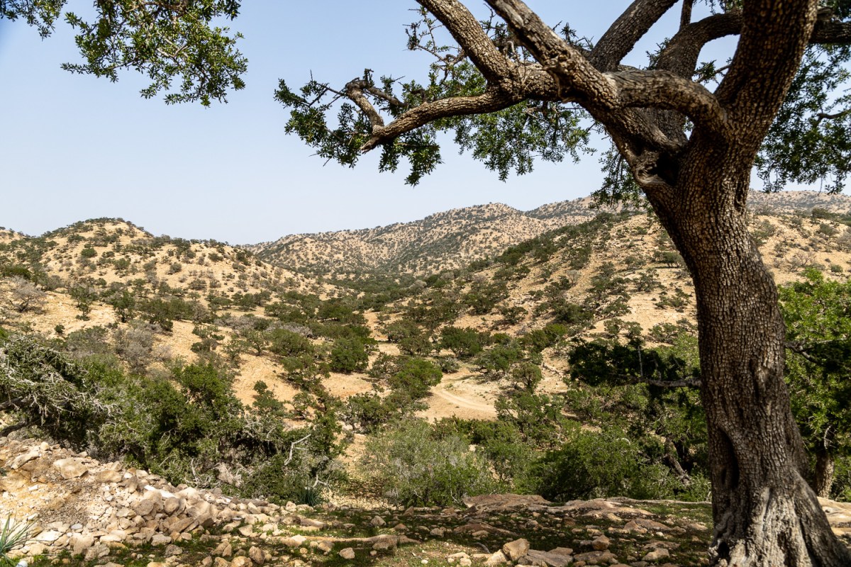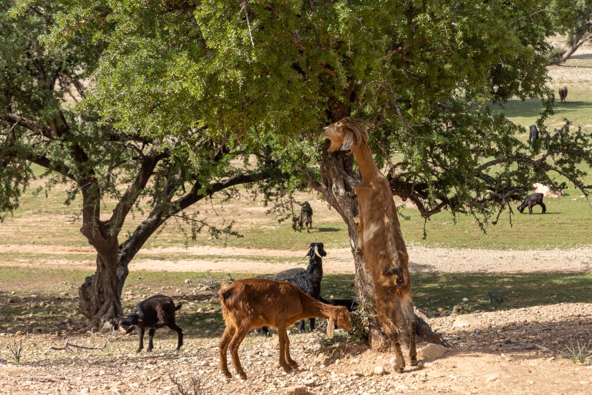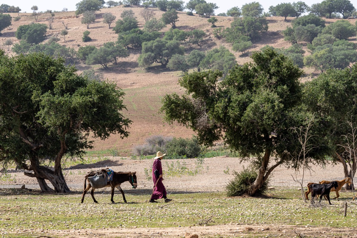 La route du bord de mer (RP2201) traverse les collines plantées d’arganiers. Les chèvres s’y régalent des baies et le berger se prête au jeu des photos.