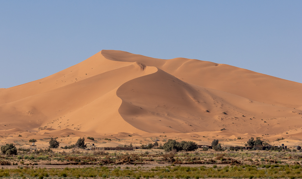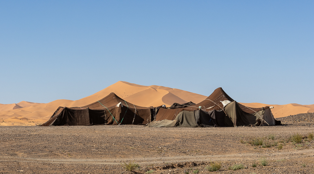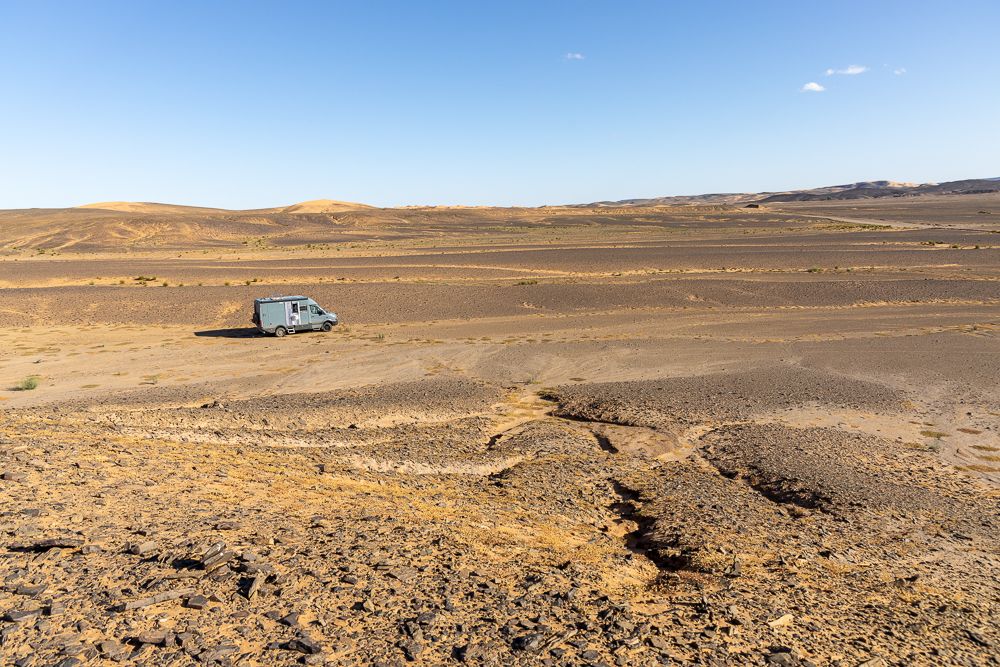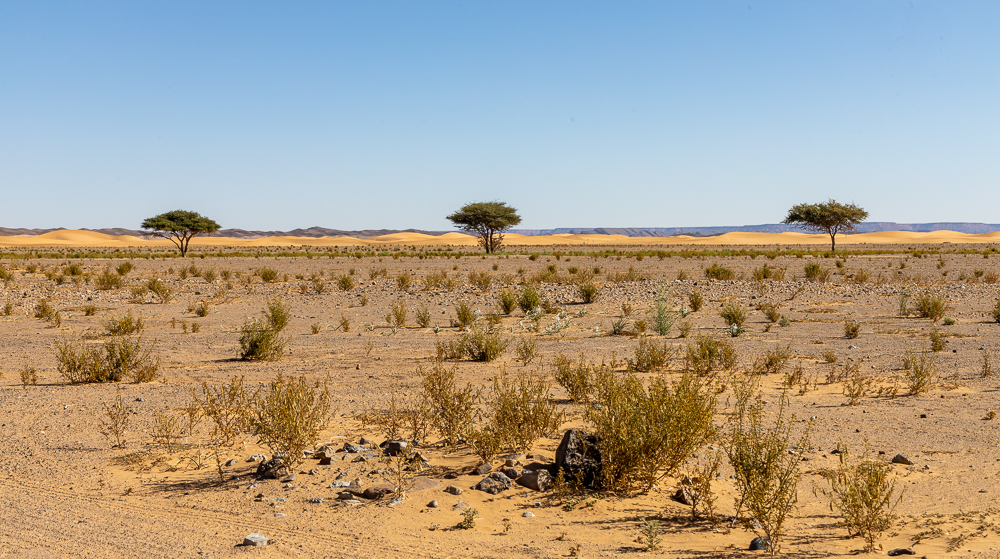 Nous évoluons entre les bosquets de tamaris. Puis arrive un reg, une zone de pierraille, à perte de vue. Enfin les dunes de l’erg Chegaga, que nous verrons de loin. C’est ici qui nous étions venus en 2022 à pied et à dos de dromadaire pour bivouaquer 3 jours dans ces dunes.