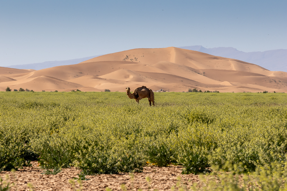 Le désert est vert, les herbes habituellement sèches sont maintenant bien grasses pour le plus grand bonheur des chameaux et des photographes. Elles bruissent du bourdonnement des insectes.