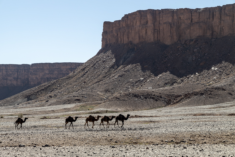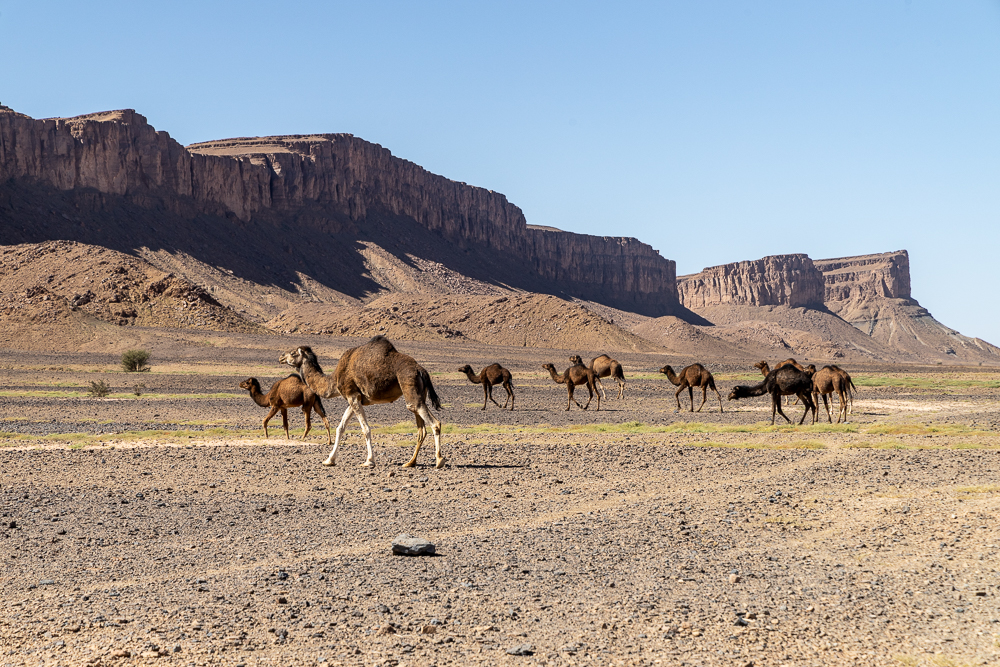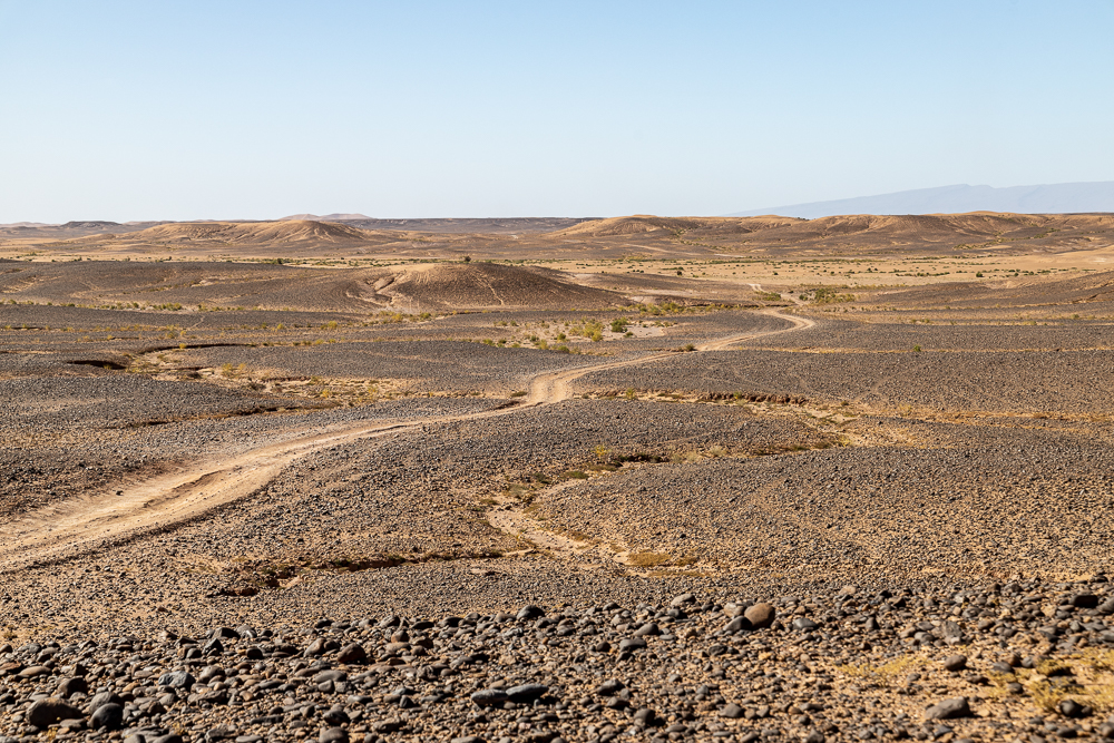 Nous découvrons le lac Iriki, boueux. Pourtant, il y a quelques semaines, il était en eau après 10 ans de sécheresse. Encore en peu de sable, puis c’est un long plateau de pierres sèches jusqu’à Foum Zguid.