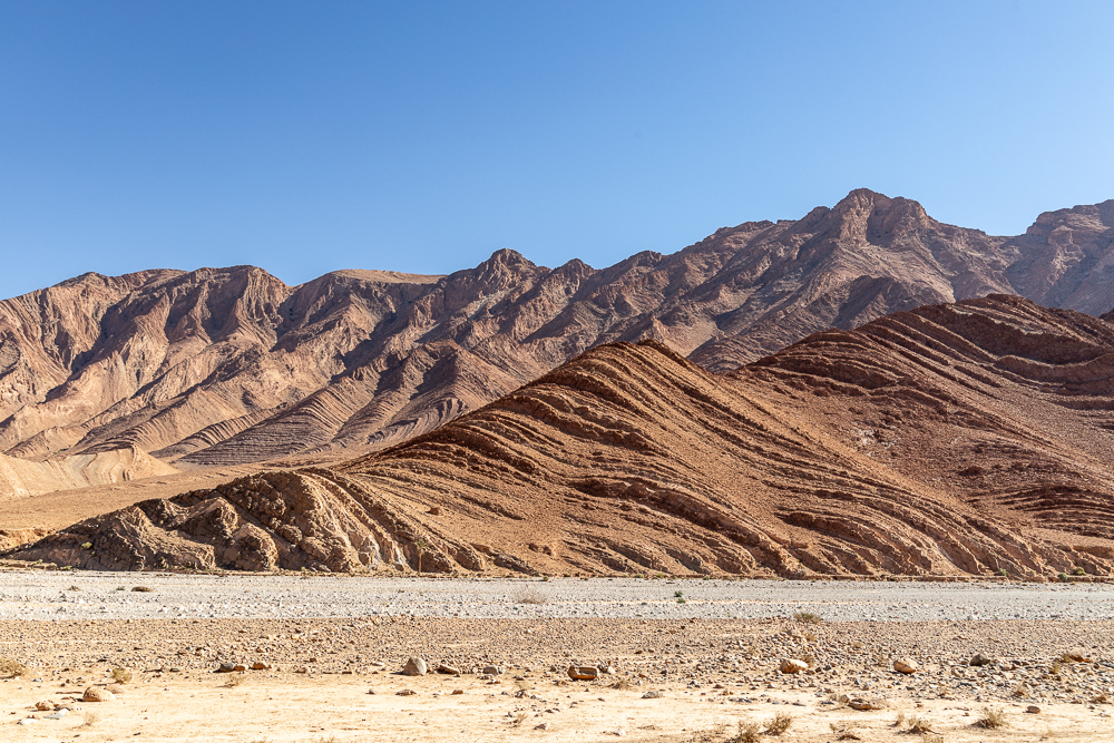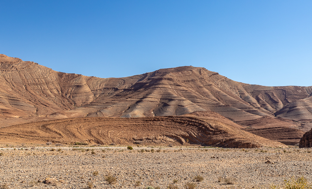 Nous parcourons l’anti Atlas et ses superbes paysages de montagnes plissées entre Tata et Tafraout par les routes RN7 et une petite route sans numéro entre Tichgach et Azgour qui évite le détour par Igherm.