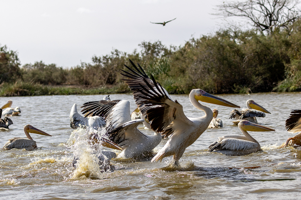 Il nous amène voir des espèces locales que nous n’avons pas ou peu l’occasion de voir en Europe. La liste est longue mais parmi nos amis, certains seraient curieux d’observer: le Pélican blanc par milliers, le flamant rose, la spatule blanche, le Cormoran Africain, la Talève d’Afrique, le Balbuzard pêcheur, le Pygargue Vocifère, le Martin pêcheur pie, le Anhinga d’Afrique (oiseau serpent), le Tantale Ibis, le Canard à bosse, le Dendrocygne veuf rassemblé en nuée par centaines de milliers, le Jacana à poitrine rose, l’Aigrette Ardoisée, l’Aigrette des récifs, le Guêpier vert, un crocodile, un varan, un chacal, la cache et les traces d’un python parti en balade qui nous a laissé sa mue. Et je dois en oublier ! Tous photographiés même si ne sont présentés ici que quelques spécimens.