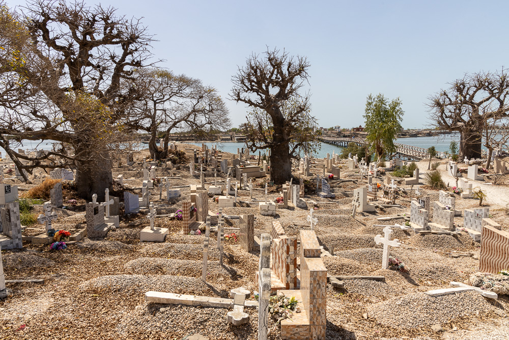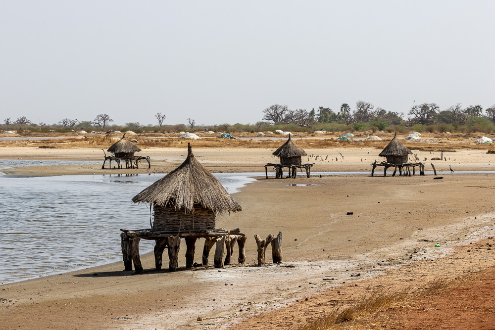 En remontant la langue de Palmarin nous longeons les exploitations de sel (récoltées au milieu des déchets plastiques) et les ensembles de greniers à mil qui ponctuent le paysage jusqu’à Joal-Fadiouth.