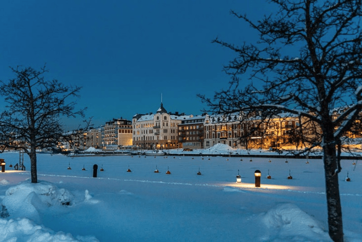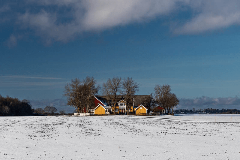 Trajet par la Belgique, l’Allemagne, le Danemark, avec le même itinéraire que cet été pour aller en Islande, 1300 km, un peu long, mais la promesse de la neige à perte de vue nous motive. Traversée de la mer du nord entre Grena et Halmstad, une simple formalité, puis remontée vers le nord par la côte au plus court. Les paysages enneigés apparaissent un peu au nord de Stockholm. Les étendues agricoles d’un blanc immaculé, avec les fermes isolées et colorées sous le soleil sont superbes.