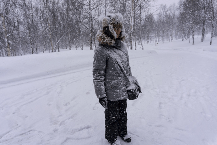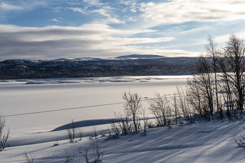 Soleil radieux, des forêts de bouleaux à perte de vue, la température baisse encore jusqu’à -23° et la route blanchie. Plus loin, les hauts plateaux qui précédent la chaîne de montagne entre la Suède et la Norvège sont époustouflants de beauté, tout en blancheur.