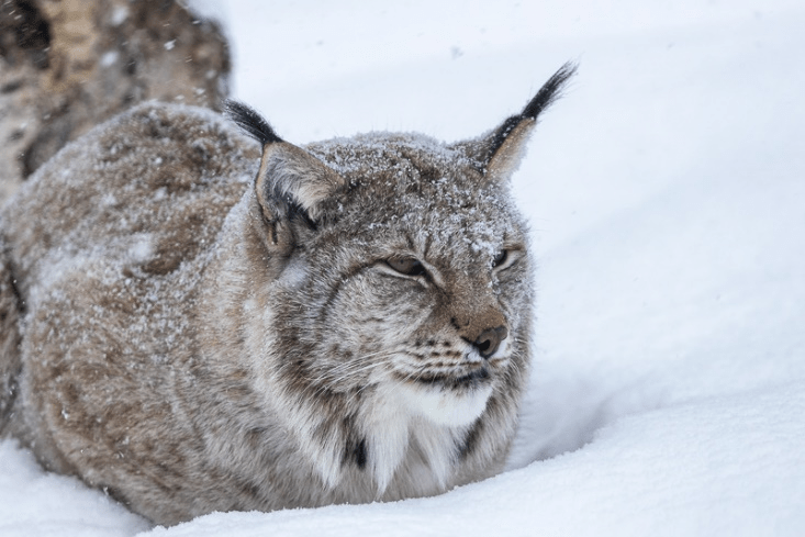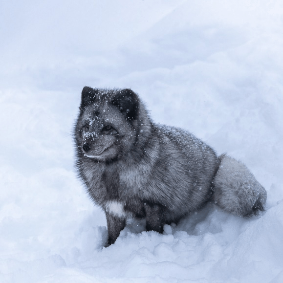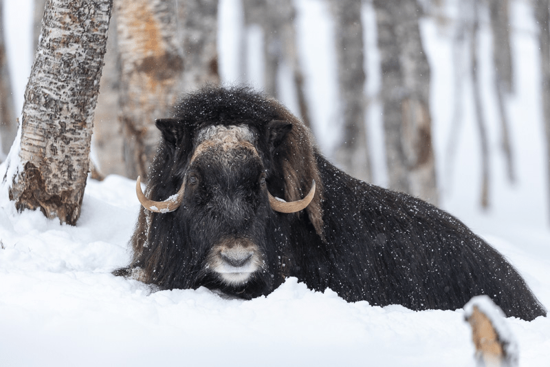 Nous bivouaquons sur le parking du parc à l’invitation du personnel et le lendemain nous observons pendant plusieurs heures, lynx, loups, renards arctiques, bœufs musqués, rennes et élans en semi-liberté, toujours sous une grosse chute de neige et un gentil -6 qui entretiennent bien l’ambiance.