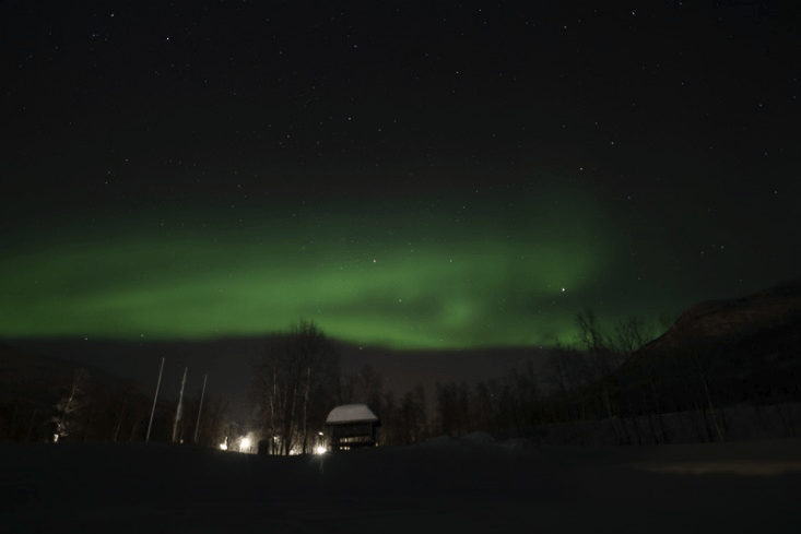 Et vers 21h avec les appareils sur pied… une première lueur blanche… on déclenche et merveille il y a du vert sur la photo… puis dans le ciel la lueur devient verte, puis plus vive et un quart d’heure plus tard disparait. Mais une seconde aurore inonde cette fois tout le ciel durant une heure ! il fait -20°, nous avons un peu froid au pied, mais des images plein les yeux ! Bien évidemment le chauffage a de nouveau gelé et nous redescendons donc jusqu’au fjord où la température avoisine -10° ce qui nous permet de passer le reste de la nuit au chaud.