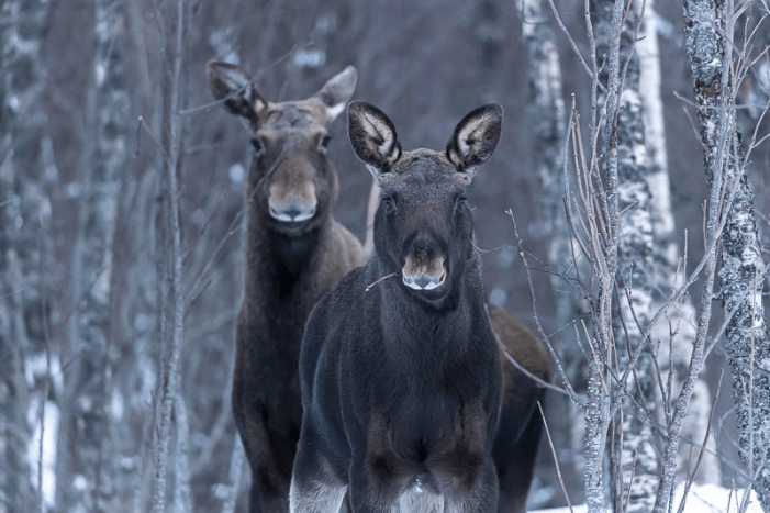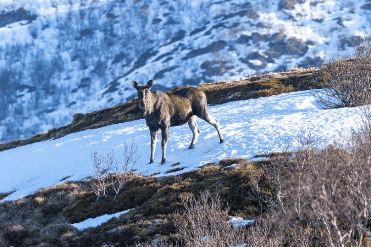 En route, à l’occasion d’un arrêt café, nous observons deux élans, bien sauvages ceux-là, sur le coteau non loin de la route, nous avons le temps de les observer et de les photographier pendant qu’ils broutaient les arbustes.