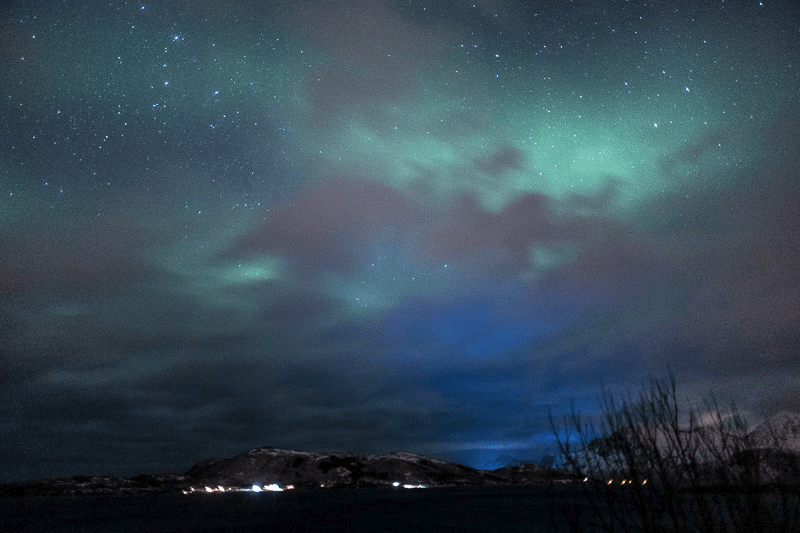 5 mars. Après une journée au temps maussade, nous arrivons à Sorreisa et avons un court moment une petite zone de ciel dégagé vers 20h. Cela nous permet de voir une aurore boréale pendant un quart d’heure avant que les nuages ne reprennent le dessus. Dommage car c’est une soirée avec une très forte activité, nous sommes bien placés, nous aurions pu en voir de très belles.