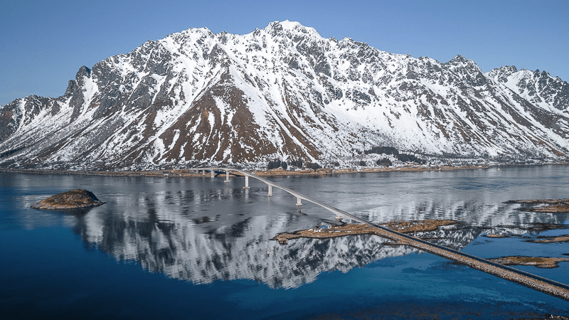 Avec un temps dégagé pour la première fois depuis 10 jours que nous sommes en Norvège, nous faisons route vers les Lofoten. La route E10 serpente en fond de vallées et traverse les montagnes enneigées qui nous entoure par de longs tunnels.
