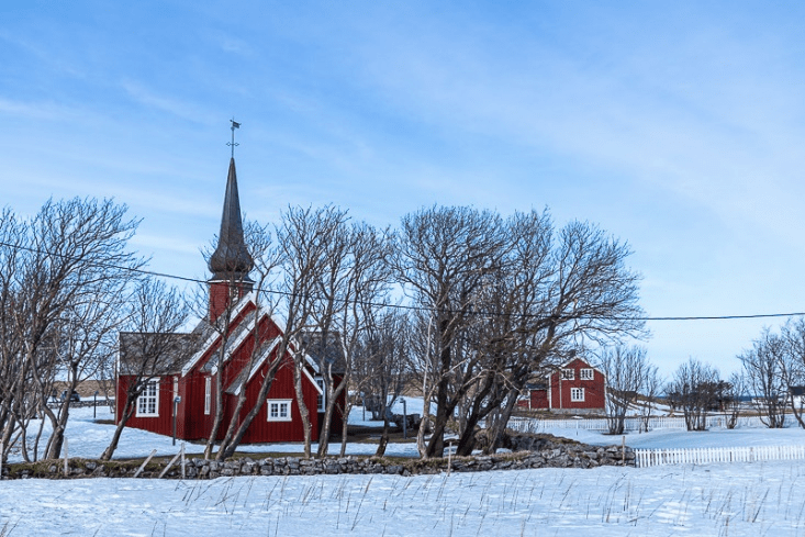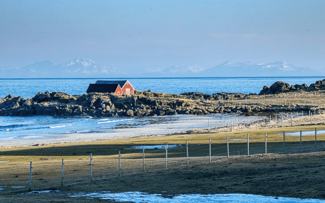 La côte sud montagneuse et escarpée contraste avec la côte nord plus plate où apparaissent çà et là des plages sauvages et des prairies entre les falaises. Le site de la petite église solitaire de Flakstard (68.10577° N 13.30769° E) en est un exemple.