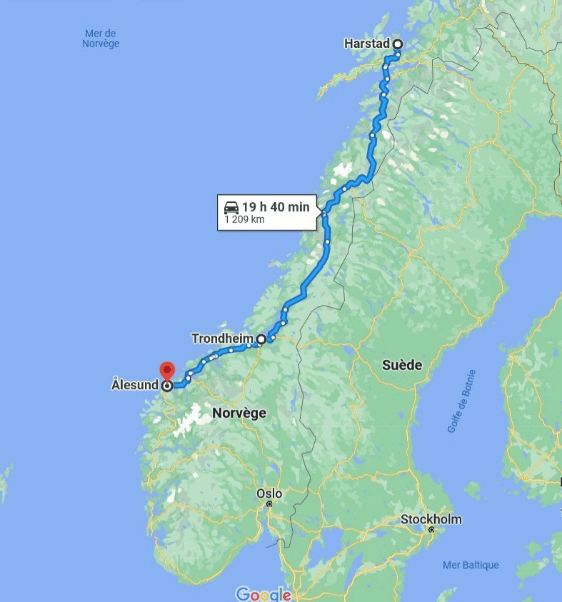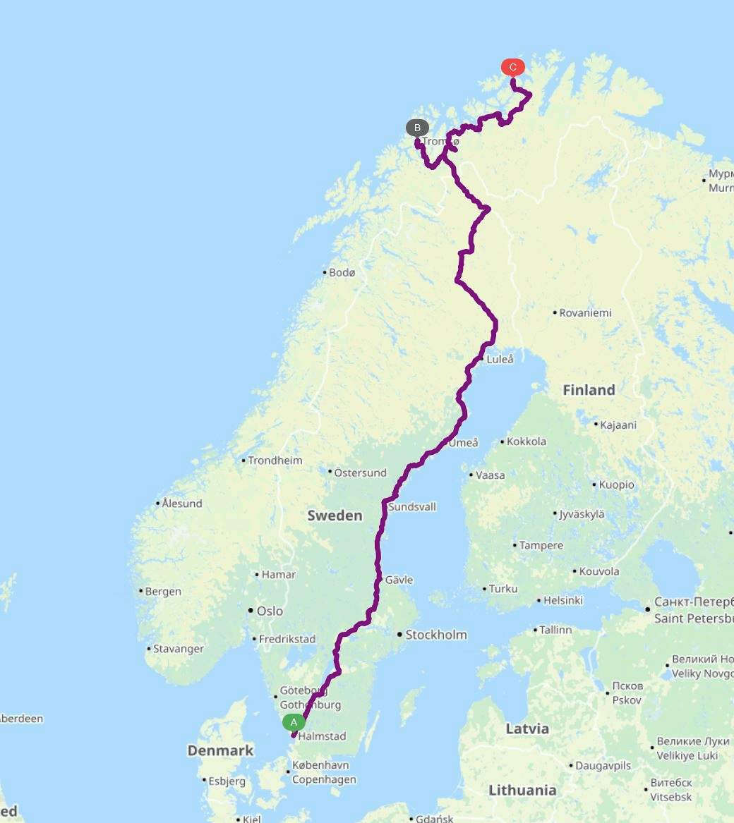 L’itinéraire prévu entre Halmstad (A) et Hammerfest (C) en passant par Tromso (B) : 2600 km