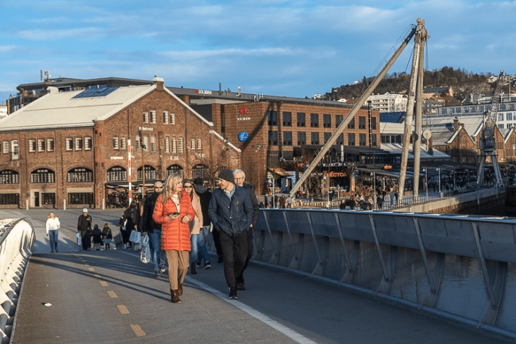 Trondheim. Le soleil joue sur les façades colorées des anciens entrepôts du canal de la Nidelva, au rythme et à l’alignement parfait. Un ensemble très spectaculaire sur 500 m de long. A l’arrière des entrepôts côté rue, les petites maisons en bois de la même époque où se trouvent quelques-uns des bistrots branchés.