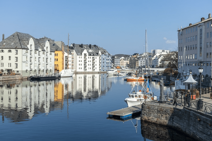 Cette ville atypique en Norvège a été entièrement reconstruite suite à un incendie dans les années 1905, dans le style rococo-art nouveau de l’époque. Cela lui confère un style très homogène bien différent de la tradition nordique