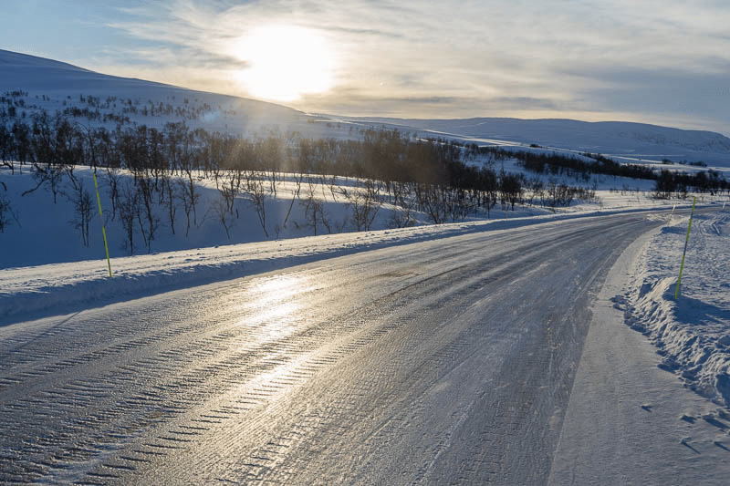 Toutes les routes sont enneigées en permanence, très très verglacées. Je préconise fortement l’équipement du véhicule avec pneus cloutés même en 4×4. Le voyage est envisageable en 2×4 avec pneus cloutés, il n’y a pas de forte pente. Nous avons parcouru 1500 km sur les routes parfois enneigées, souvent verglacées ou en glace vive.