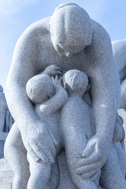 C’est lors de notre précédent voyage en Norvège, que nous avions découvert le Sculpteur Gustav VIGLAND. Nous ressentons les mêmes émotions en revoyant ces sculptures de bronze et de granit aux expressions pleines de sensibilité dans les postures et les regards. Elles sont visibles en accès libre dans un parc à l’ouest de Oslo.