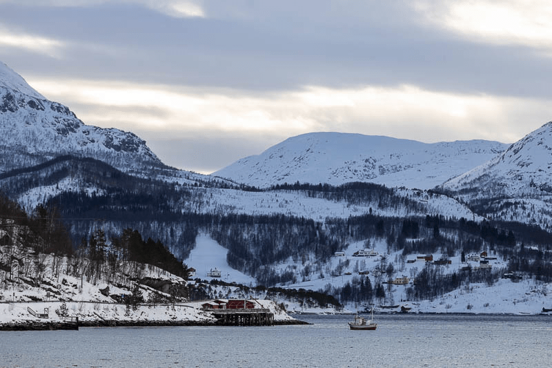 Nous entamons la route direction nord vers Tromso en se donnant le temps, nous sommes désormais proche de notre destination, il est temps de profiter. Le temps est nuageux il neigeotte, la découverte des fjords sous la neige nous ravit.