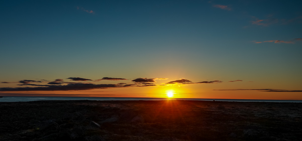 Toujours direction nord pour nous positionner sur un point d’observation nous permettant de bien voir le soleil de minuit, ce 20 juin le temps c’est mis au beau depuis le milieu de journée. Superbe route 875 avec le soleil qui nous fait l’honneur de nous accompagner pour la première fois depuis notre arrivée. Nous nous plaçons sur un léger promontoire face au nord près du phare de Hraunhafnartangi le point le plus septentrional d’Islande, pour attendre 23h et le démarrage d’une prise de vue en timelaps. Bivouac dans la lande face au soleil de minuit.