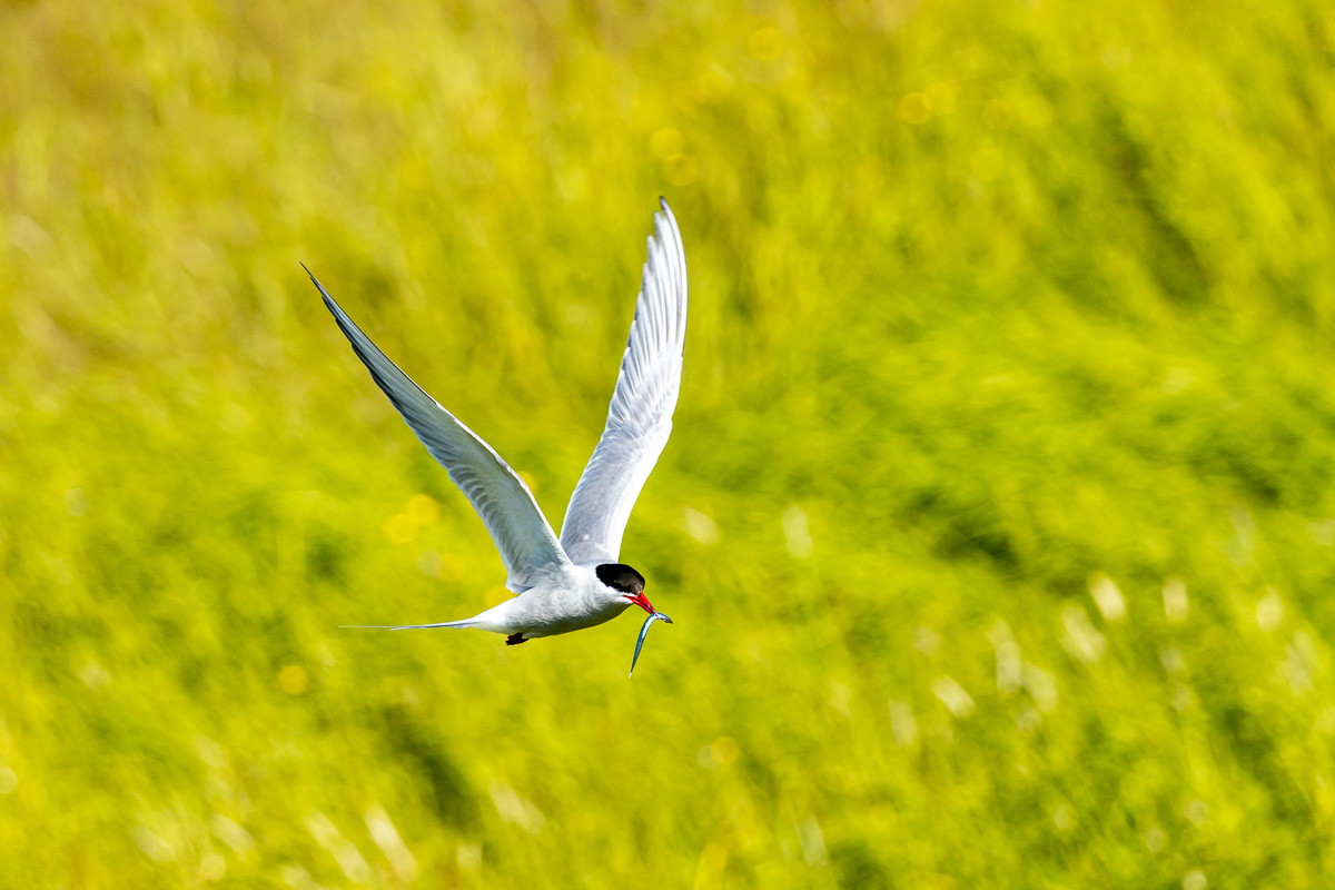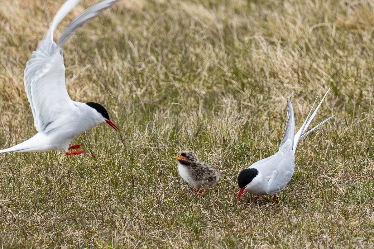 Retour vers la côte où nous retrouvons les Sternes Arctiques qui ne manquent pas une occasion de nous agresser car nous sommes sur leurs territoires. En contrepartie, je profite de leur relative proximité pour faire quelques photos en plein vol des oiseaux avec la nourriture destinée à leurs partenaires qui couve. Avec leur vol toujours aussi rapide et aux trajectoires erratiques, les maintenir dans le cadre au 600 mm est aléatoire.