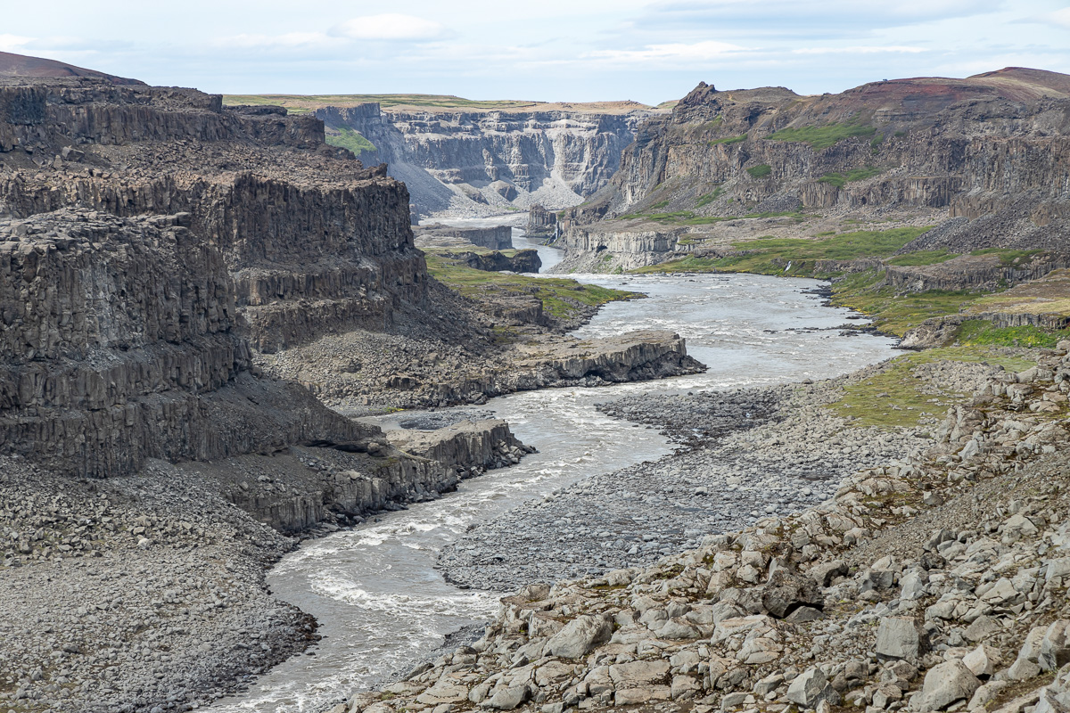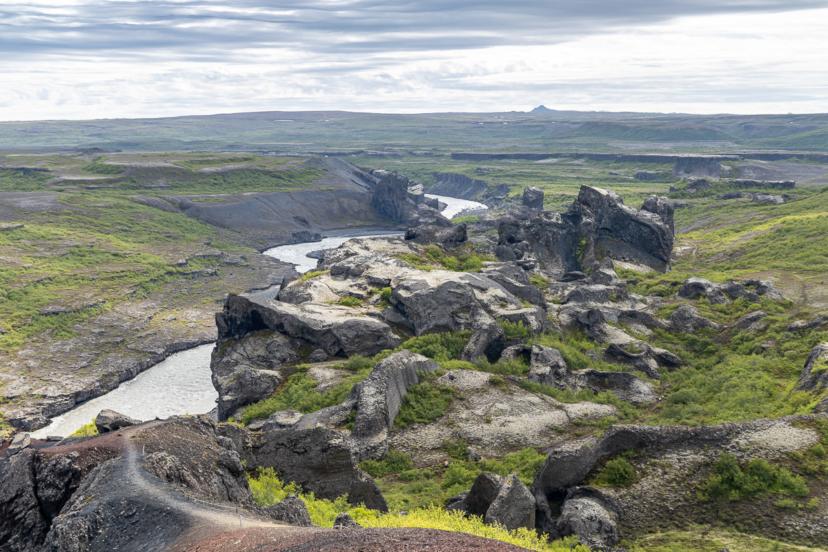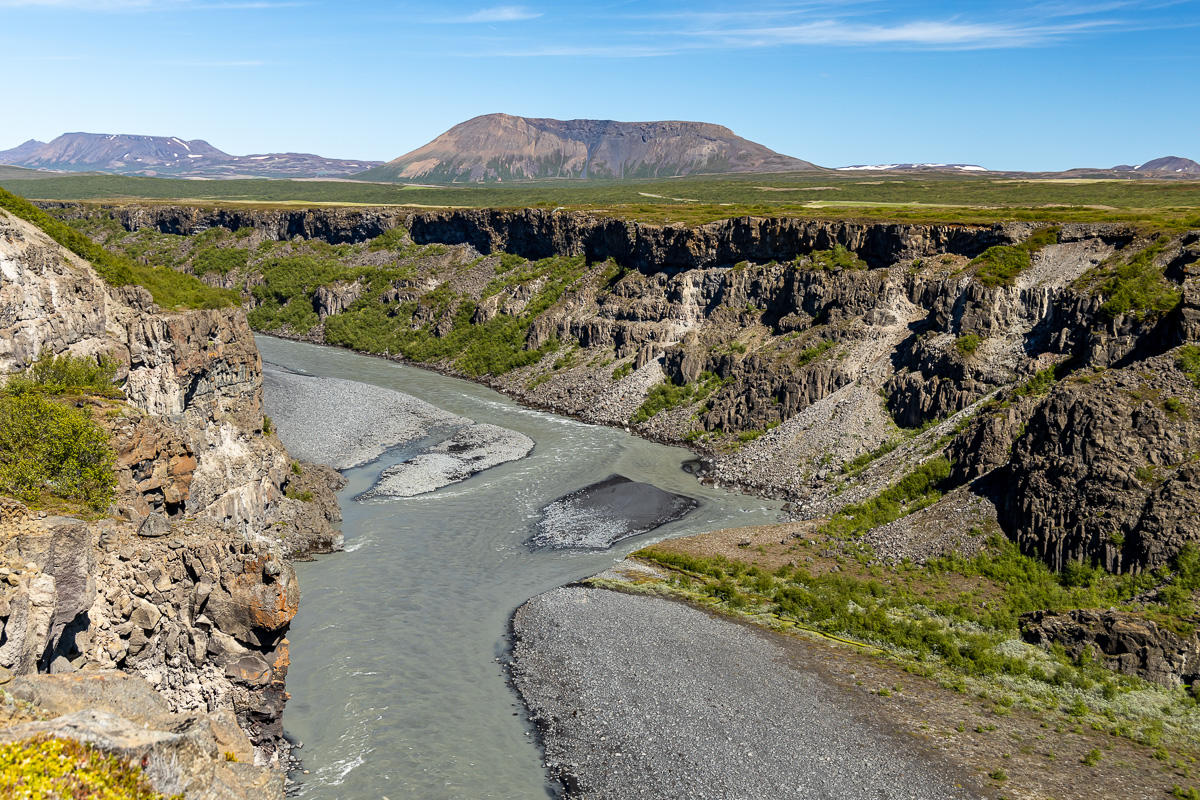 Le nord de l’Islande est traversé par une grosse rivière la JOKULSA qui a taillé une belle gorge de 25km dans sa partie avale au travers des anciennes coulées de lave sculptant au passage d’étranges formations. Aujourd’hui le soleil est présent, nous en profitons pour faire de longues balades le long de cette gorge en traversant une lande vallonnée couverte d’une végétation rase et de bouleaux nains torturés par les intempéries, d’où émergent des plies de laves. Un peu plus loin, ce sont de véritables montagnes qui dominent de 200 m la rivière avec des plissements des coulées de laves gigantesques.