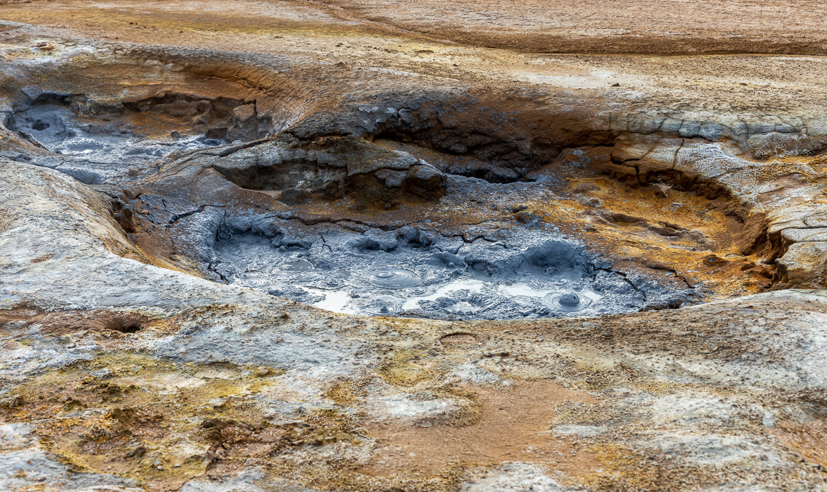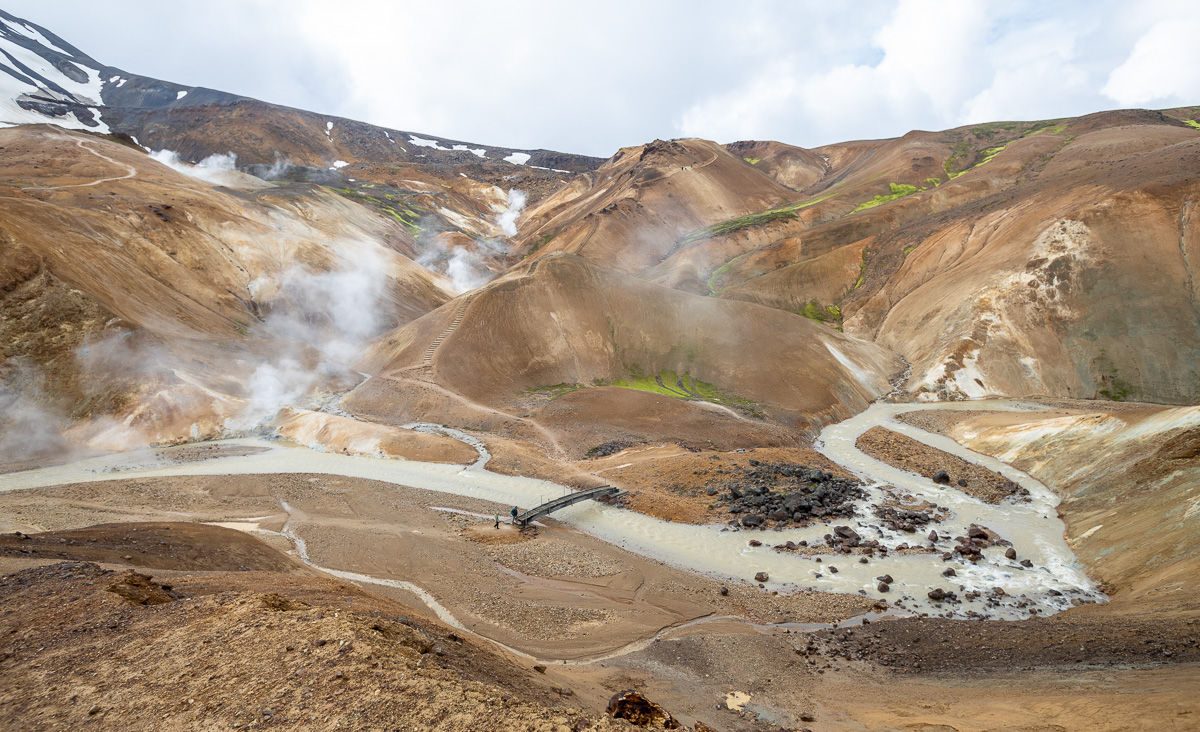 Mais le lieu le plus extraordinaire de la région est HVERADALIR, un site géothermique perdu dans le massif de KERLINGARFJOLL (sur la piste F347 au final un peu musclé) d’un relief tourmenté, tout en nuances d’ocre, de jaune et de blanc avec les projections de vapeur au milieu de la glace qui témoignent d’un sous-sol qui semble pouvoir exploser d’un instant à l’autre.