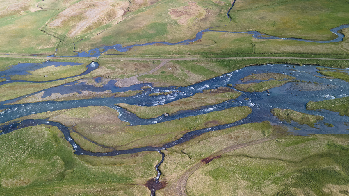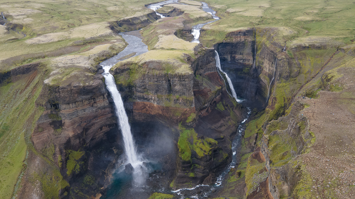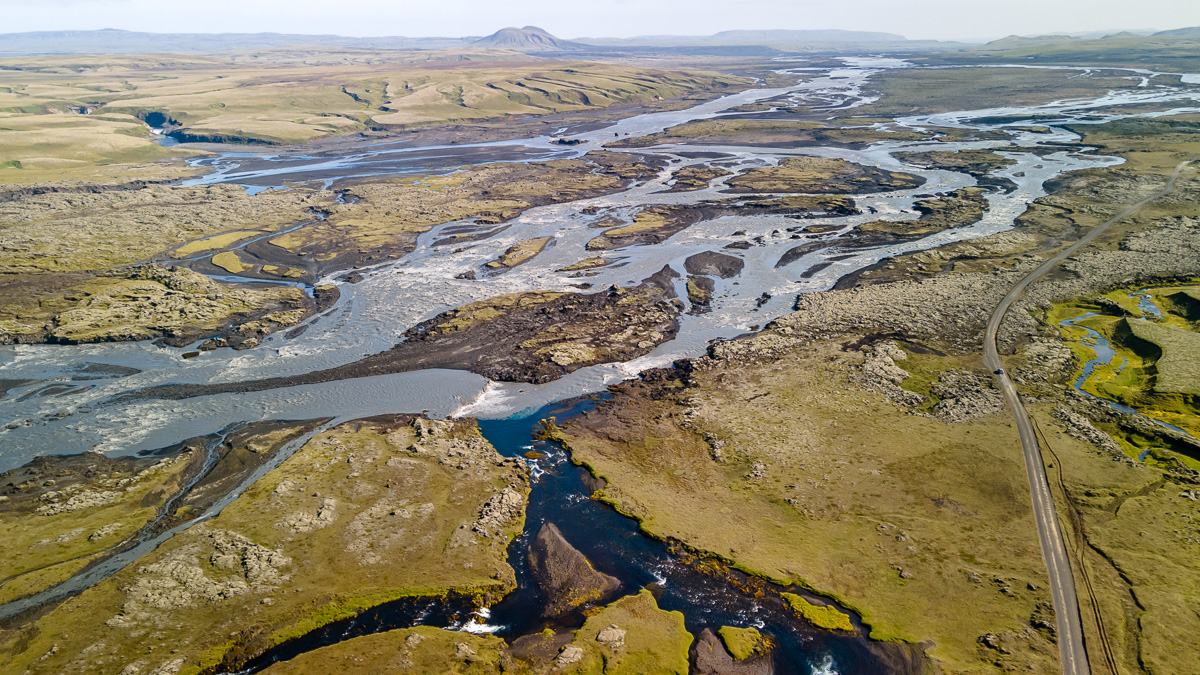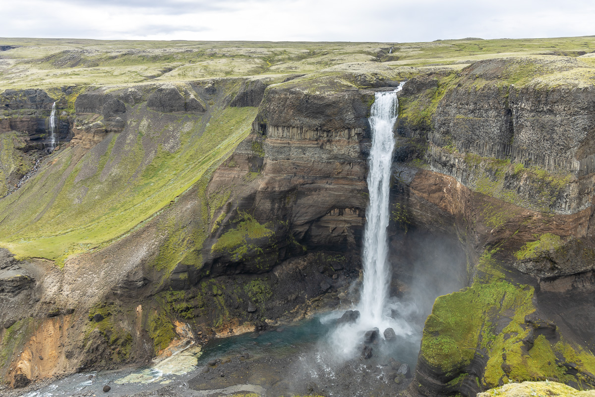 Vallée de l’énorme fleuve PJORSA qui vient du centre avec pour point d’orgue (basaltique) la cascade de HAIFOSS 34,205° N, 19,680° W, extraordinaire pour la beauté du site en gorge dans cette roche noire au milieu du plateau herbeux. 130 m de chute verticale, une des plus hautes d’Islande.