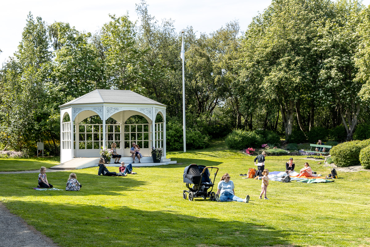 Un petit tour en ville à AKUREYRI. Shooping, restau. Le soleil est bien présent avec des températures très confortables, nous sommes samedi les Islandais profitent du soleil en tee-shirt, à table et dans les jardins publics.