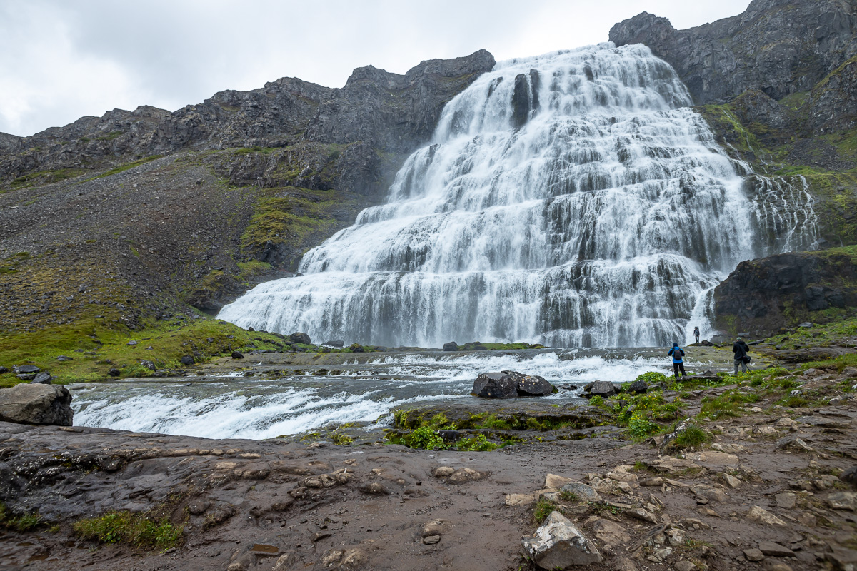 Balade vers la chute VALAGIL, en gorge de 100 m de haut. Encore une chute me direz vous. Mais elles sont toutes différentes et la plus spectaculaire dans la région est celle de DYNJANDI. Un véritable rideau d’eau descend du plateau en une nappe répartie sur une très grande la largeur.