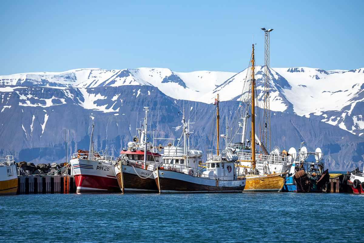 Le petit port de HUSAVIK a beaucoup de charme avec ces vieux bateaux de pêche en bois réhabilités pour les sorties d’observations des baleines.