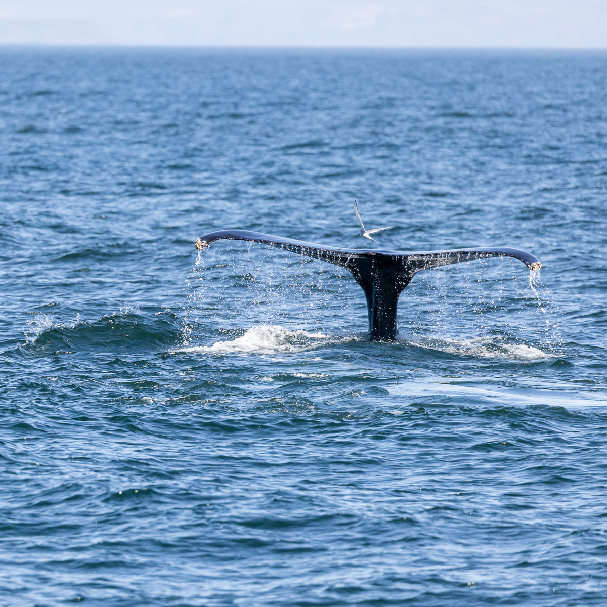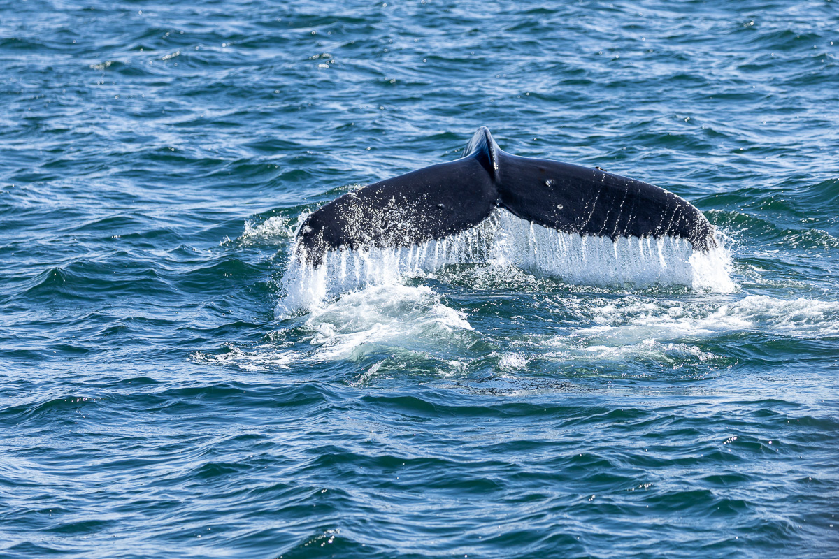 Le temps se maintient au beau. Nous rejoignons Husavik pour faire une sortie d’observation des baleines très présentes dans cette baie riche en nourriture et qu’affectionnent la baleine à bosse (17m) et le rorqual commun (25m). Nous n’en verrons que le dos et la queue mais leurs mouvements tout en souplesse quand elles sortent leur queue hors de l’eau au moment de la plongée, sans une vague, est très spectaculaire.