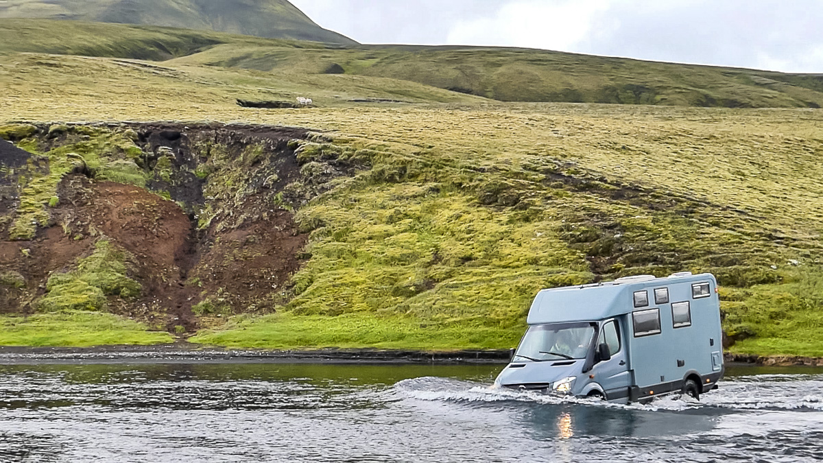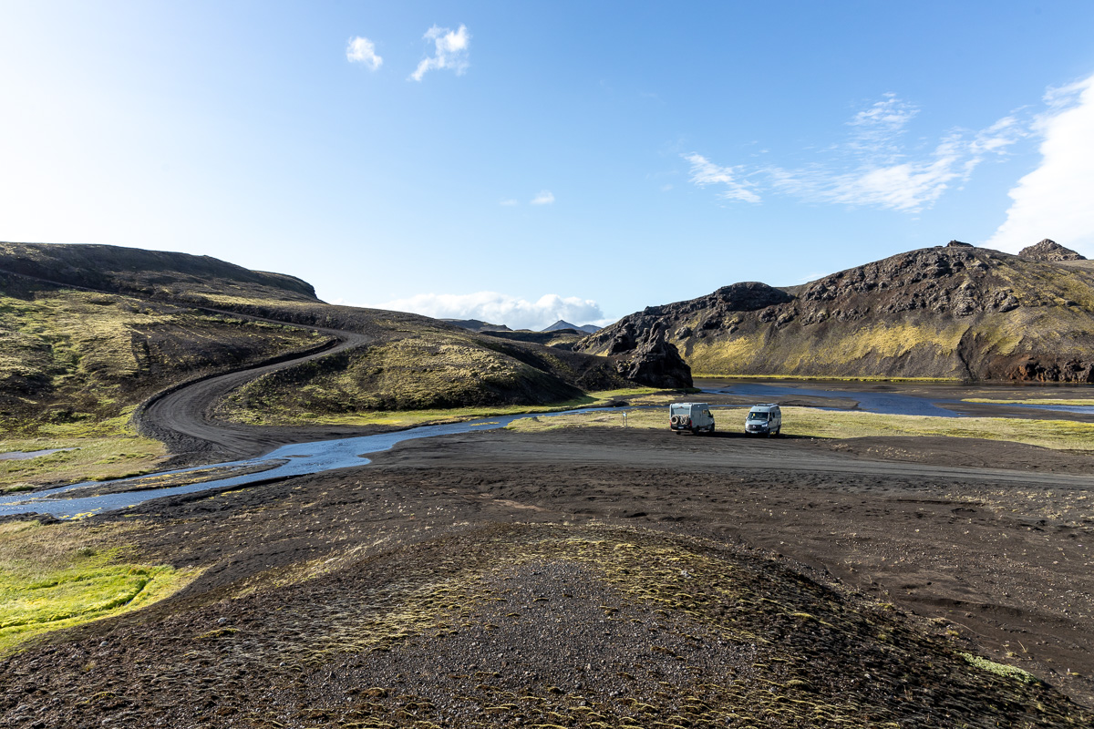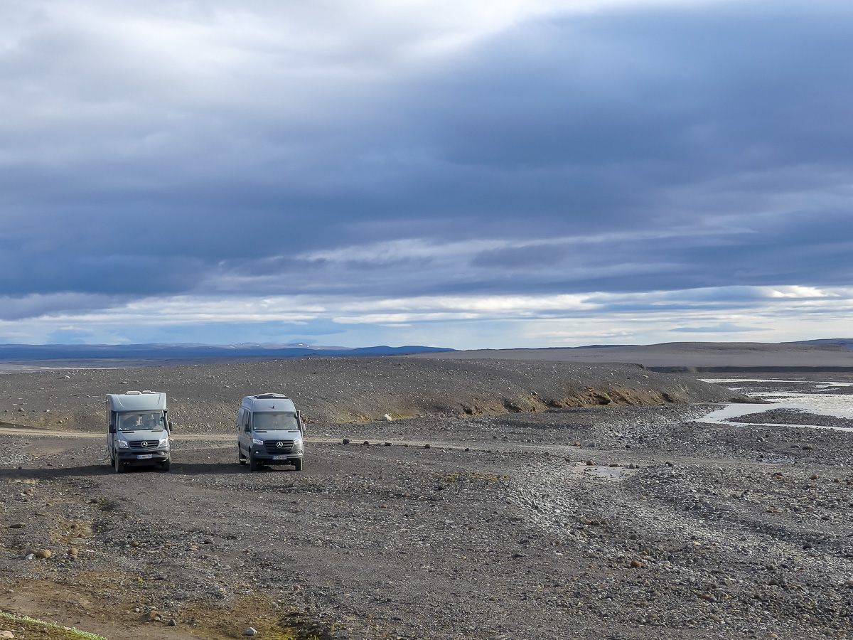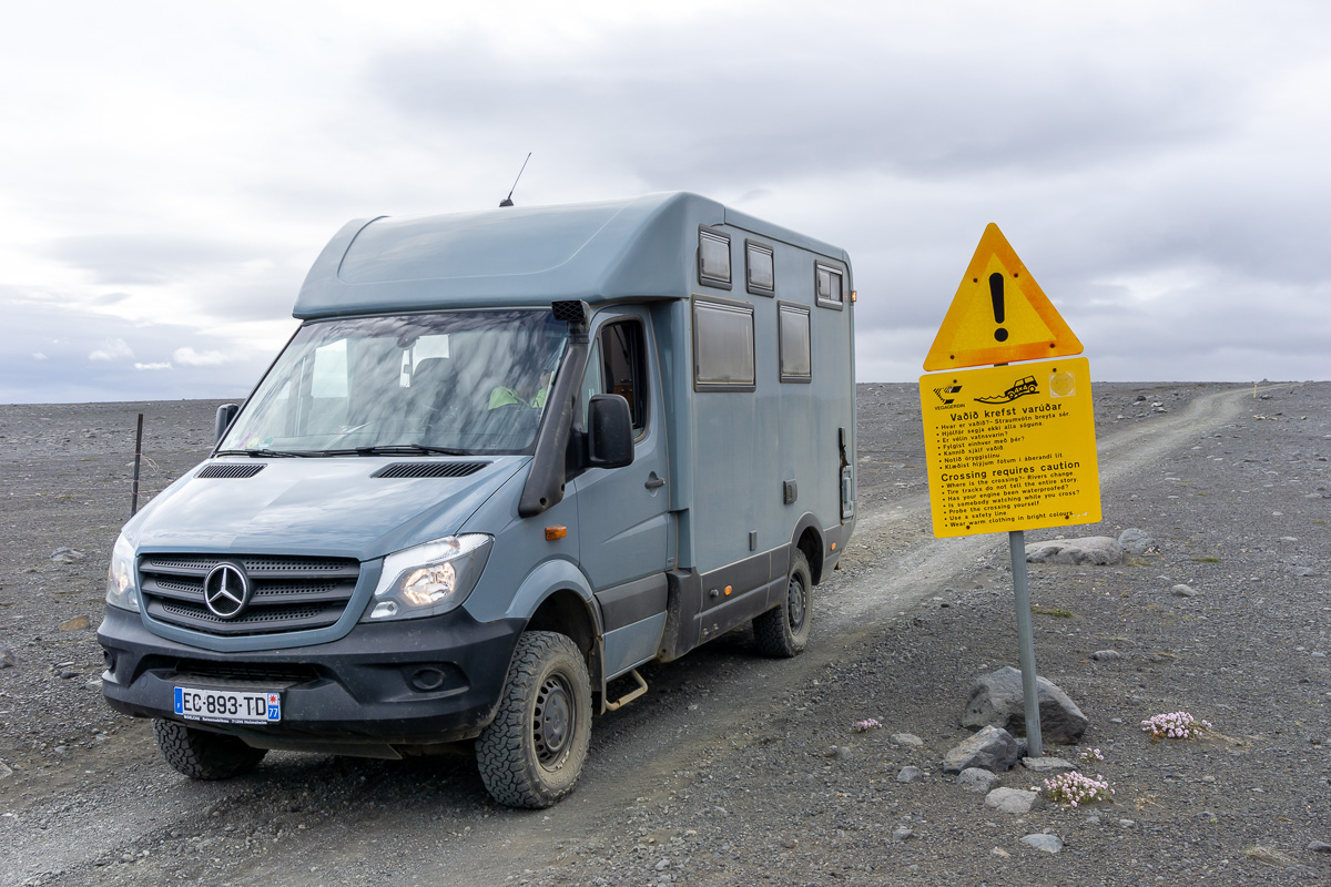 Des Islandais avec un véhicule similaire aux nôtres décident de ne pas passer et d’attendre le lendemain matin, ils confortent notre sentiment. Nous bivouaquons donc sur place, bercés par le bruit du torrent. Le lendemain le niveau a bien baissé ce qui le rend empruntable.
