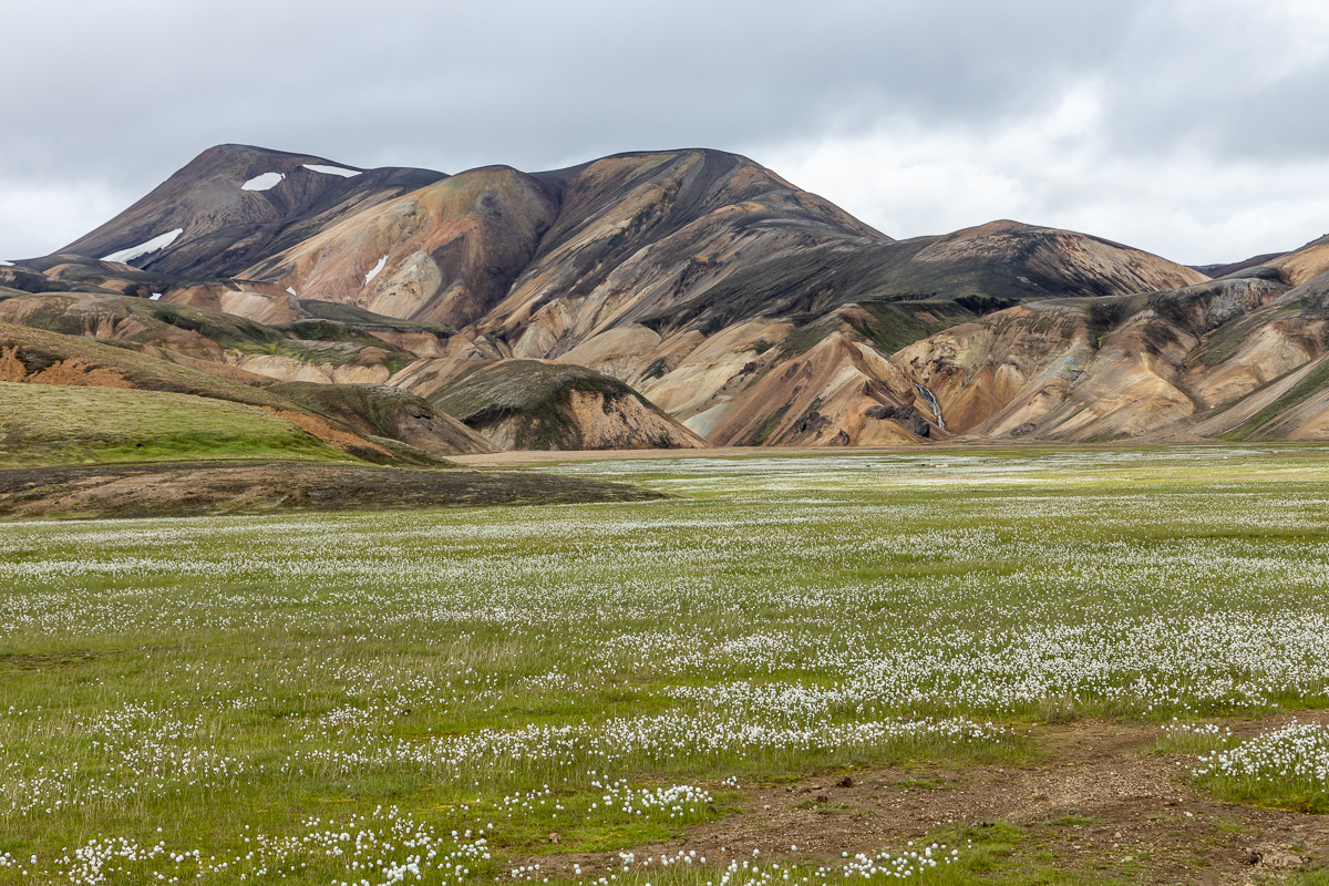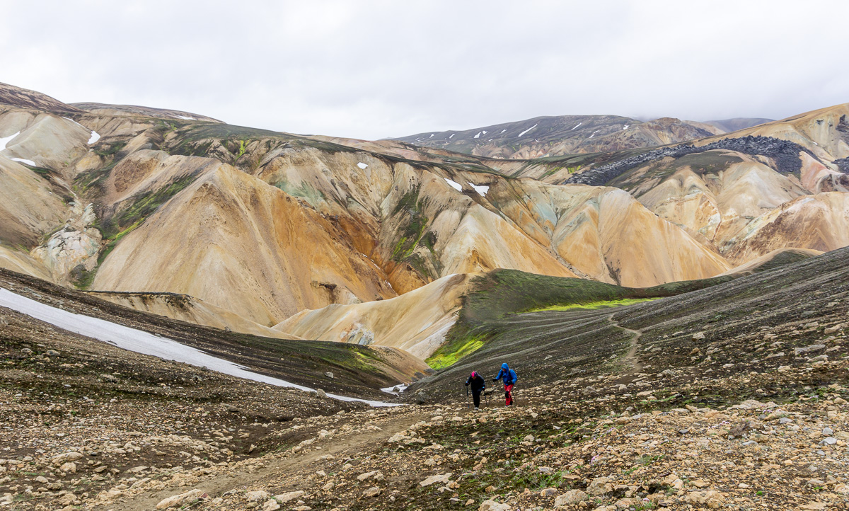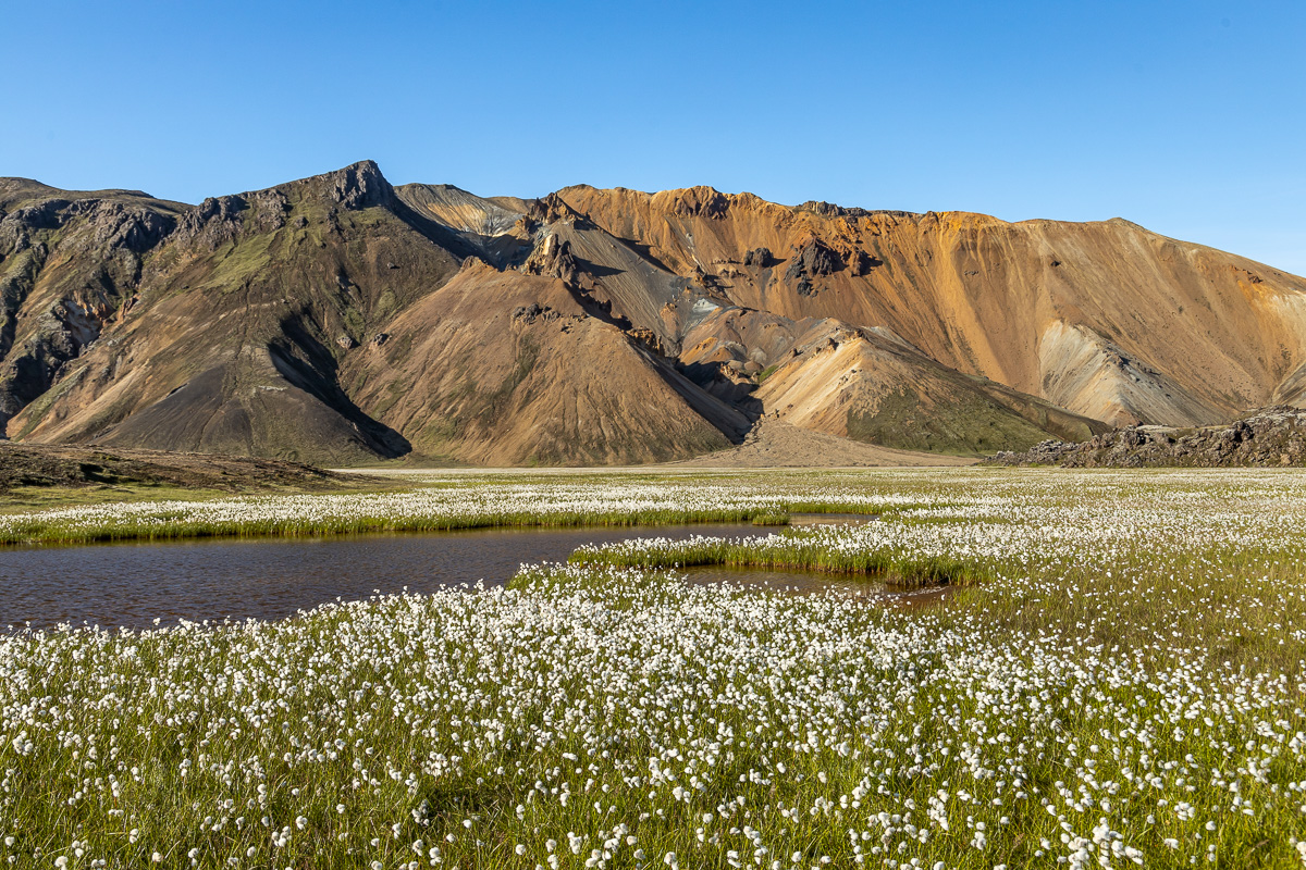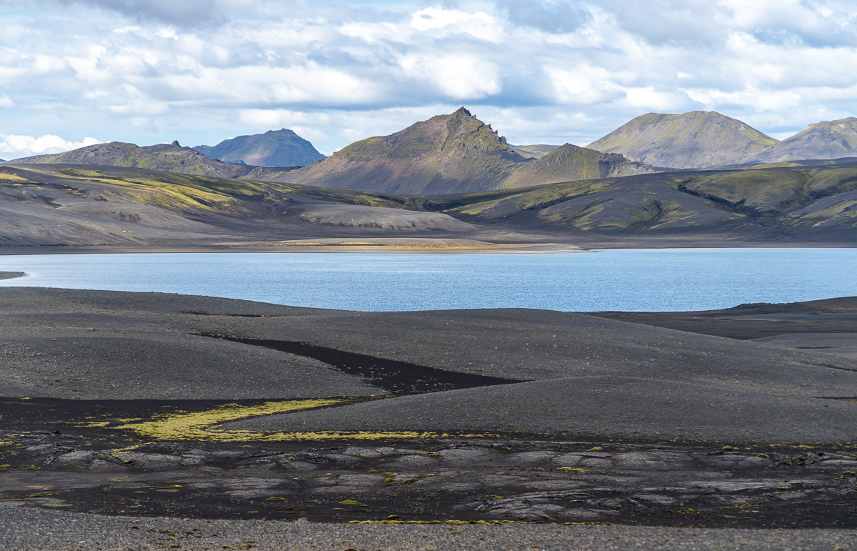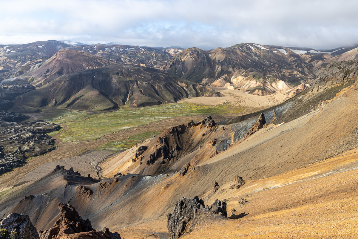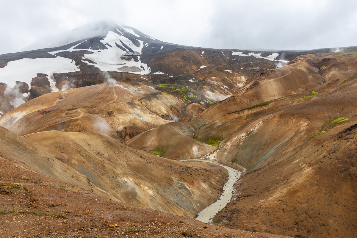 Le temps se maintenant au beau, nous décidons de retourner à LANDMANNALAUGAR car il y a 3 semaines, le mauvais temps nous en a chassés. C’est un des plus beaux paysages de l’Islande avec ses montagnes aux teintes toutes en nuances d’ocre, de vert, de gris, les inévitables fumerolles et champs de laves. Nous ne sommes pas loin de la faille. Je profite du soleil pour monter au sommet qui nous domine ; le SUDURNAMUR.