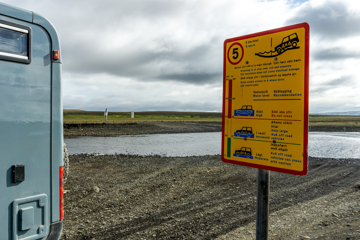 Bien que le mois de juillet soit bien entamé les torrents sont encore chargés et les gués assez hauts. Arrivés au dernier gué important à 100 km avant ASKJA sur le F910, 64,820° N 17,874°W, le niveau et le débit sont trop importants pour que nous puissions traverser en sécurité.