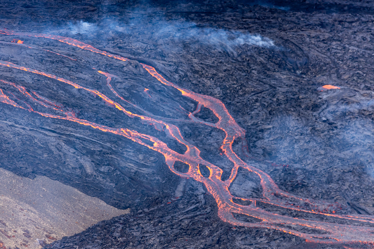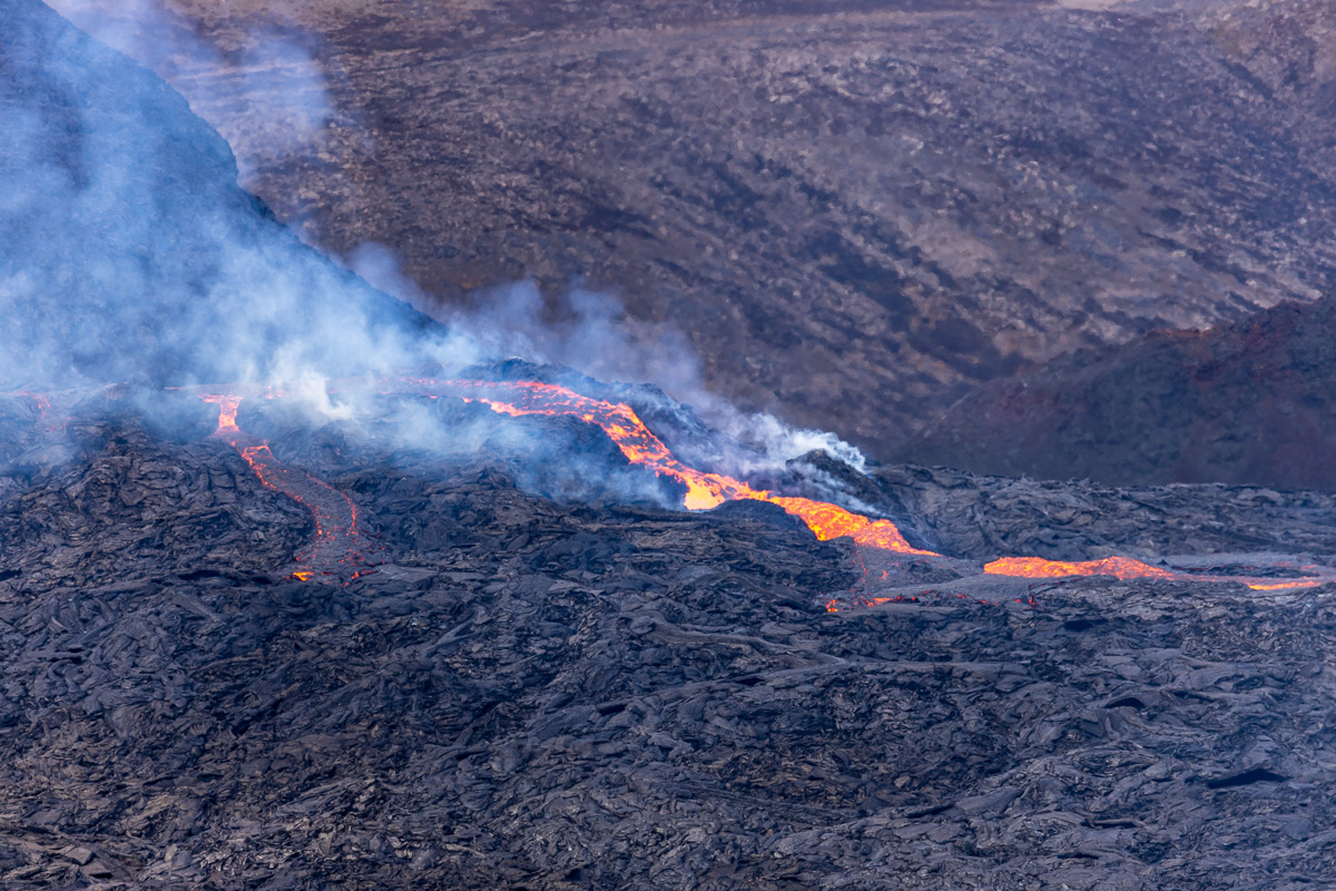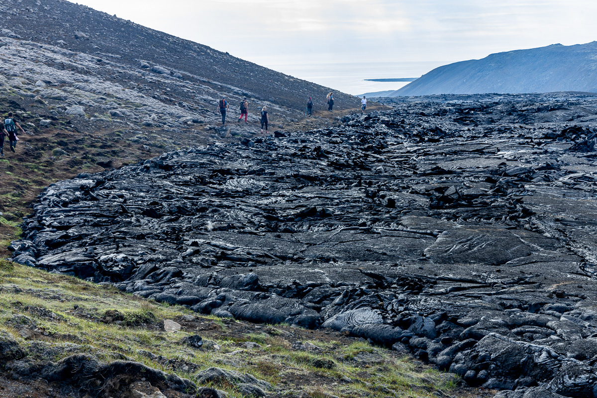 Depuis le 19 mars 2021, date de son éruption qui était attendue, il a rempli les vallées environnantes. Au retour nous longeons une longue coulée fumante, encore tiède, qui fait bien 4km de long. L’écoulement principal se faisant désormais sur un autre versant. Mais la route 425 est à moins de 1 km des premières coulées qui pourraient être de nouveau alimentées !