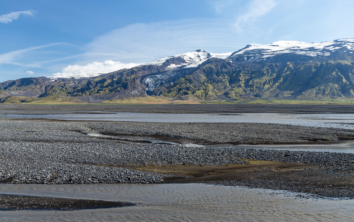 Nous savons que l’accès au très beau site montagneux de PORSMORK se fait par une piste aux gués difficiles, la F249, le long d’une très grosse rivière la KROSSA. Des alertes à l’entrée signalant qu’elle est réservé au 4×4 surélevé nous le confirme. Un gué, puis deux, sans grandes difficultés, nous en avons une dizaine à franchir. Puis devant un gué plus important, nous attendons le passage d’un véhicule pour évaluer sa profondeur. Un TOYOTA le franchit sans problème. Devant notre interrogation, le conducteur nous précise que le suivant est « a little more deep », un peu plus profond. Effectivement plus profond, plus large et avec du courant, un grand panneau alerte des blocs dans le fond. Comme il se doit, nous attendons une nouvelle fois le passage d’un autre véhicule. Il se présente un énorme fourgon Ford rehaussé avec de grosses roues, typiques de la mode islandaise. Nous constatons que la profondeur est gérable mais les rochers qui tapissent le fond le font bondir et rebondir malgré sa capacité d’absorption. Donc pour nous, c’est un demi tour. Dommage ! Pour nous consoler le lendemain nous longeons la Krossa sur l’autre rive par la F261. Avec le soleil qui est revenu, le paysage est superbe, montagnes verdoyantes et glacier le MYRDAJSJOKULL en couronnement.