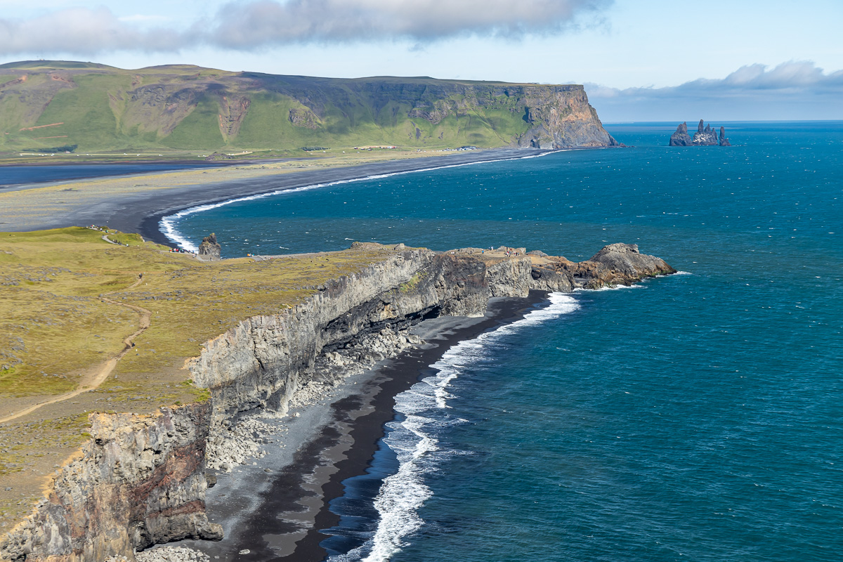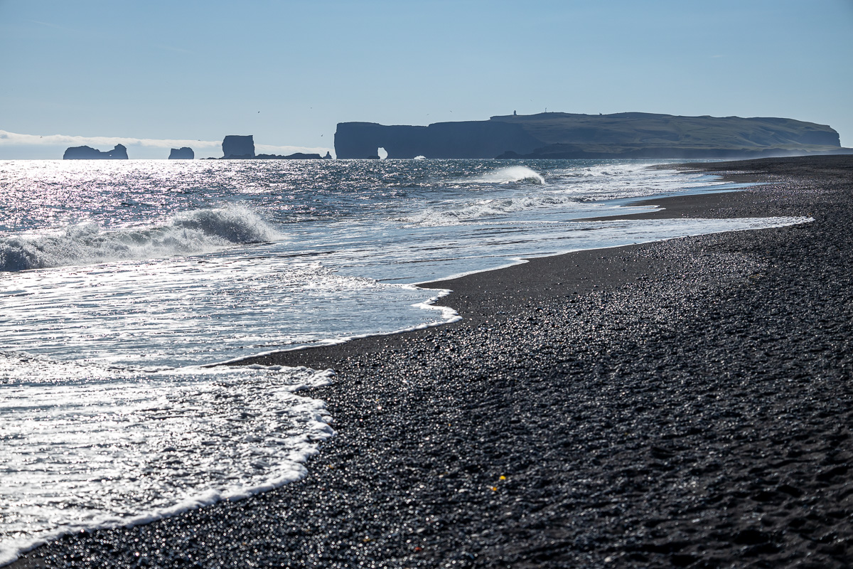 Passage par les sites magnifiques de SKOGARFOSS, la falaise de DYRHOLAEY et les orgues basaltiques de REYNISDRANGAR, apothéose du phénomène cité plus haut.