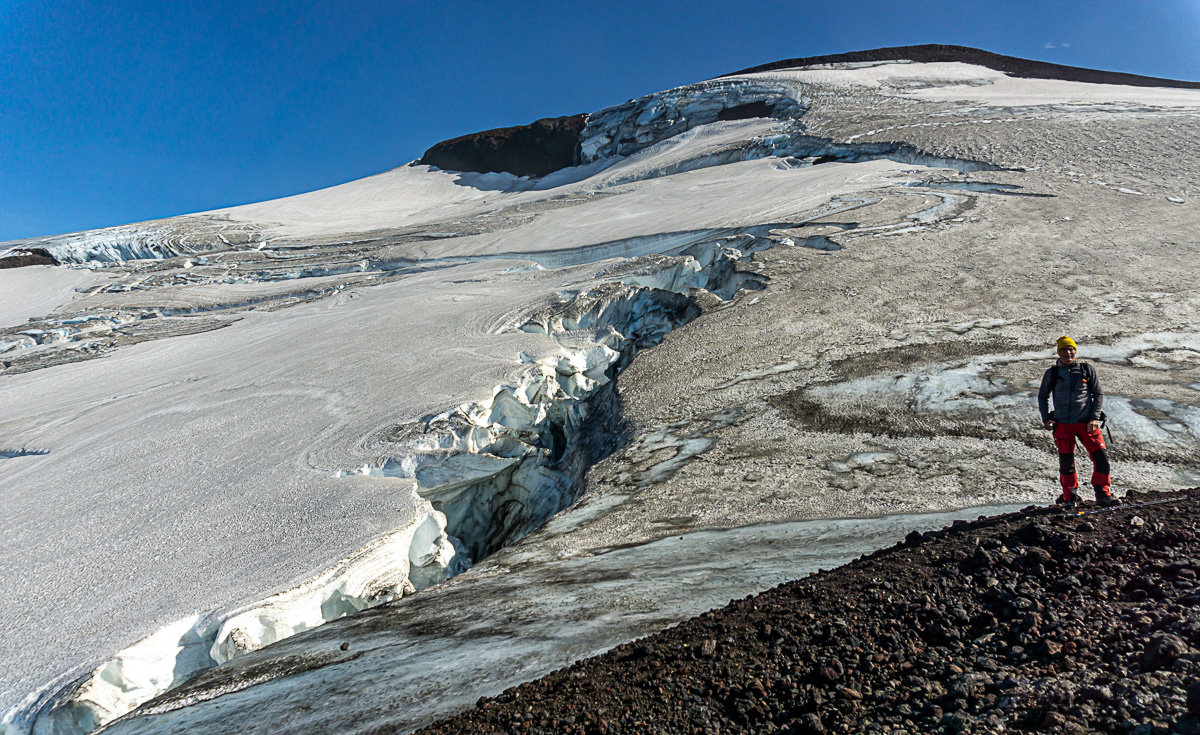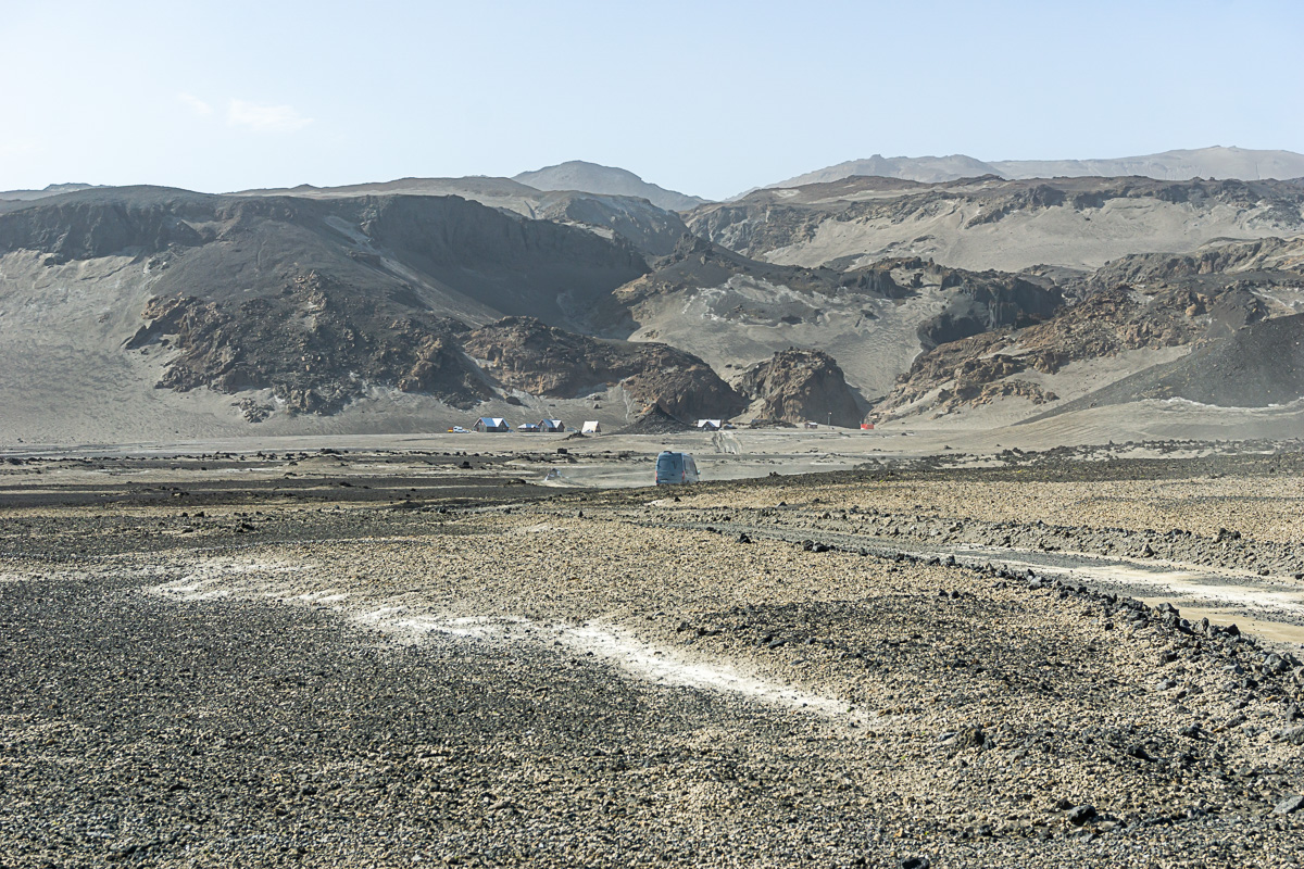 Le cratère nous est masqué du parking. Il faut transpirer un peu pour pouvoir contempler ce spectacle : 5 bons kilomètres de marche et 300 m de dénivellation sur un mauvais chemin créé pour l’occasion nous permettent d’accéder à un premier sommet en face du cratère puis à un autre un peu plus près à environ 1,5 km de distance.