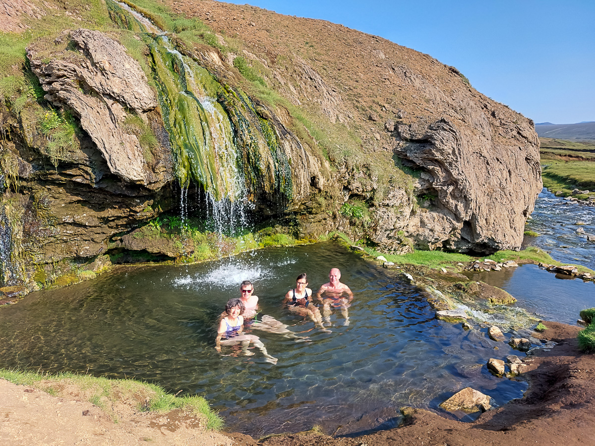 Toujours sur la faille, la baignade en rivière chaude de REYKJADALUR 64,0479° N, 21,222° W en pleine montagne, accessible après une petite heure de marche, semble très prisée des islandais,