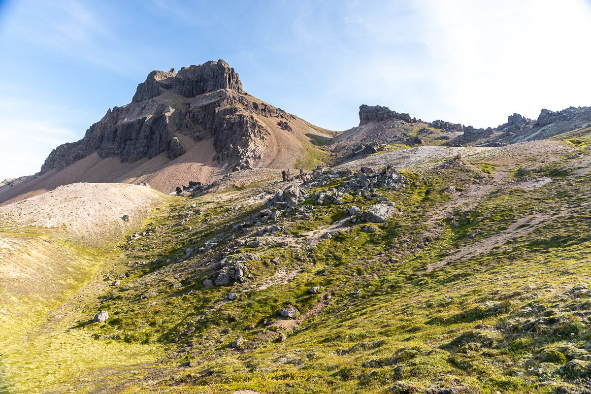 Le village de BAKKAGERDI est plein de charme avec son petit port. Sa falaise à Macareux est bien évidemment déserte en cette fin août car tous les oiseaux sont repartis en mer. Puis nous empruntons la piste F 946, assez difficile, dans un paysage très alpin vers le col HUSAVIKURHEIDI .
