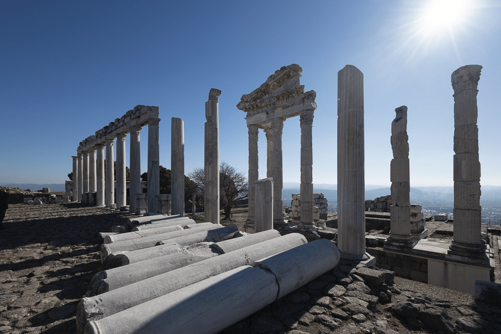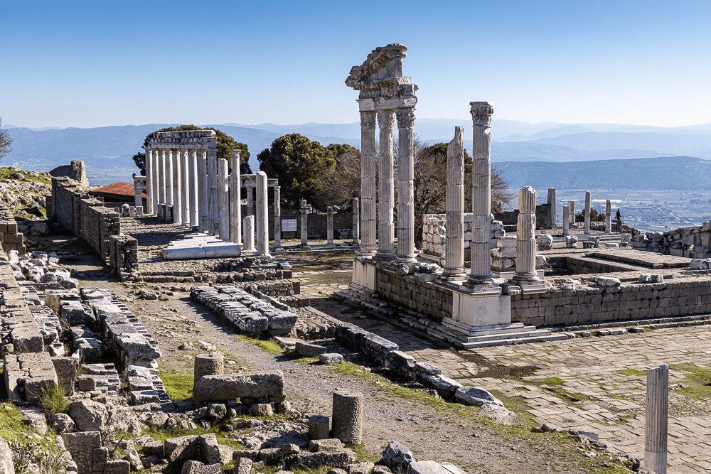Nous traversons de superbes pinèdes dans la campagne vers notre nouvelle destination : Pergame. Nous faisons le plein d’eau à l’une des nombreuses fontaines d’eau de source qui bordent la route. L’acropole de Pergame est l’un des plus importants sites Romains en Turquie (de -300 à +200), au sommet d’une colline de 200 m d’altitude, couverte d’une extraordinaire ville avec ses temples, son théâtre, son gymnasium, ses rues pavées et d’innombrables constructions de toutes sortes. Le site escarpé est étonnant.