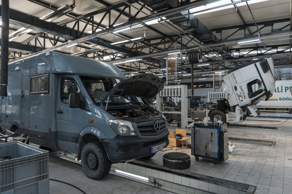 L’application « I OVER LANDER » indique un bon garage. Mais comme tous ceux des quartiers de réparateurs (les SANAYI) on y accède par des ruelles bondées, bordées de petits bâtiments inadaptés à nos camions. Dans ce dédale de boyaux, nous circulons au centimètre près ! Le premier indiqué par l’appli, nous dit qu’il n’est pas possible de rentrer notre véhicule dans son atelier et nous envoie à son voisin, … qui n’a pas le temps et nous indique un troisième… que nous n’avons jamais trouvé. Le soir arrivant, nous décidons d’aller le lendemain chez Mercedes craignant que de toute façon, ces petits mécanos bien que très aimables risquaient de ne pas avoir la pièce en stock. Or, Izmir est une méga-ville, la circulation y est très difficile et ce n’est pas un endroit rêvé pour y passer le week-end. Le lendemain vendredi, MB prend en charge le mobilcub immédiatement et fait le remplacement de la courroie dans la mâtinée. Nous y sommes très bien reçus par le personnel prévenant et invités à déjeuner à leur cantine où nous avons mangé un très bon iskender.