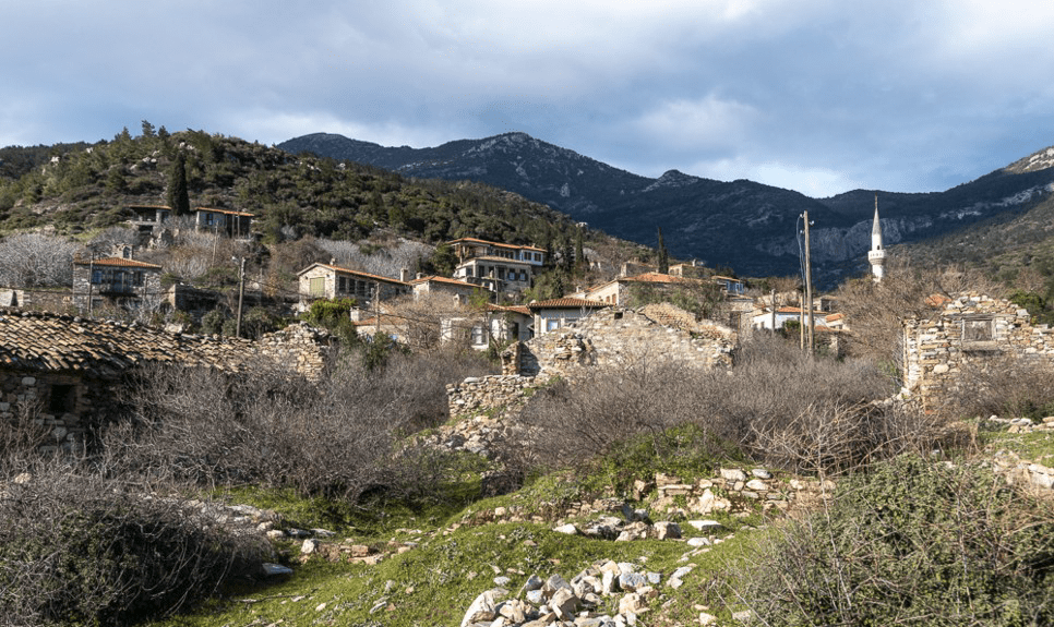 La côte sud est plus accueillante. Pour le coup, nous apprécions particulièrement le village en partie abandonné de Doganbey beaucoup plus authentique. Quelques maisons sont magnifiquement restaurées et le minaret se dresse rutilant au milieu des murs effondrés. Hors saison le village est désert, le vent souffle très fort, heureusement que le soleil y apporte un peu de chaleur.
