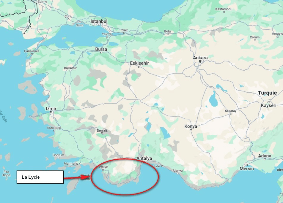 Nous parcourons la Lycie par la côte. Le peuple Lycien, mal connu, qui occupait cette petite péninsule, remonte à l’age de bronze jusqu’à sa domination par les Perses en -500, puis par les Grecs et les Romains. Les rares vestiges que les Lyciens nous ont laissés sont des sites funéraires et des quelques traces de villes remaniées par les peuples suivants.