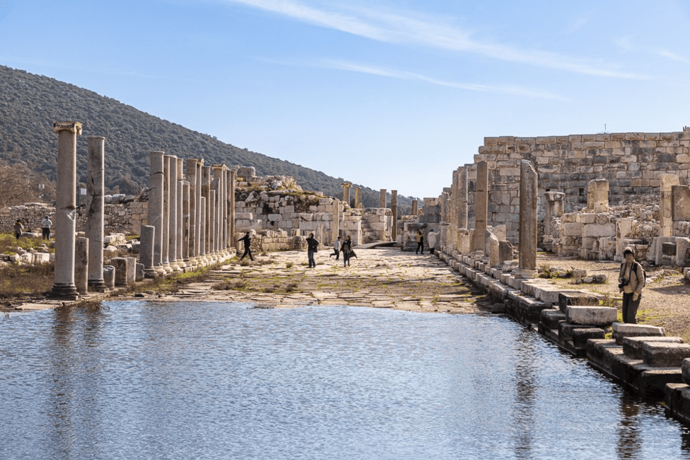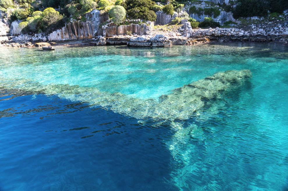 Le site n’est pas extrêmement spectaculaire mais c’est une curiosité de voir les murs de cette petite citée Lycienne qui se sont trouvés à moitié immergés sous 2 m d’eau claire suite à un tremblement de terre.