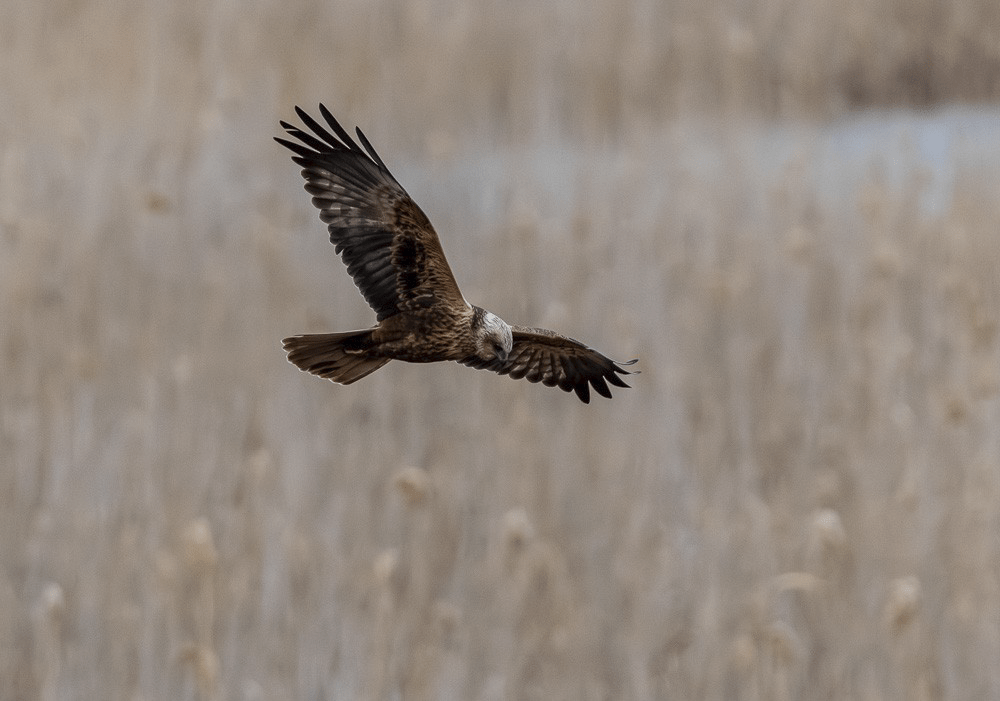 Nous profitons d’un intermède beaux temps (mais bien froid !) pour faire des observations ornithologiques sur le lac. La chance nous sourit. Depuis une plateforme d’observation, outre foulques et grèbes en parade, nous distinguons trois Busards des roseaux. Visiblement, ils sont sur leur territoire. Deux d’entre eux font des allées et venues le long de la rive au dessus des roselières et s’y posent de temps en temps à proximité de notre point d’observation. Nous y passons l’après-midi et avec de la patience, nous arrivons à les photographier lors de quelques passages, disons à entre 50 et 100 m !