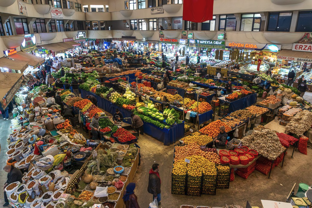 Le marché alimentaire est localisé dans un seul bâtiment où sont réunis tous les produits frais. Kadinlar Pazari 37,86837 N, 32,50122 E