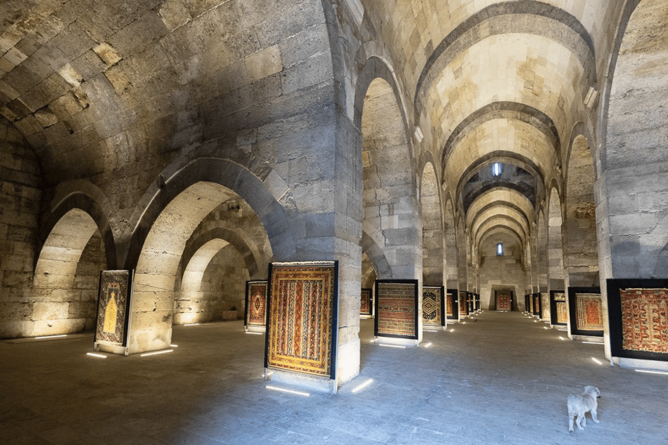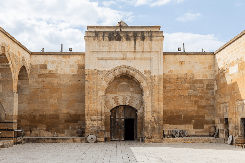 Nous sommes sur la route de la soie. Il y avait un caravansérail tous les 30 km, soit une journée de marche (nos ancêtres étaient bons marcheurs!). Le plus grand et le mieux conservé de la région se trouve Sultanhani 38,24772 N, 33,54632 E. Il remonte au XIII s. Lorsque nous y sommes passés, il accueillait une magnifique exposition de tapis.